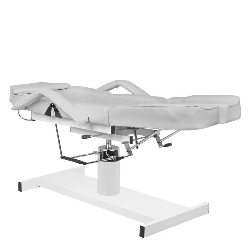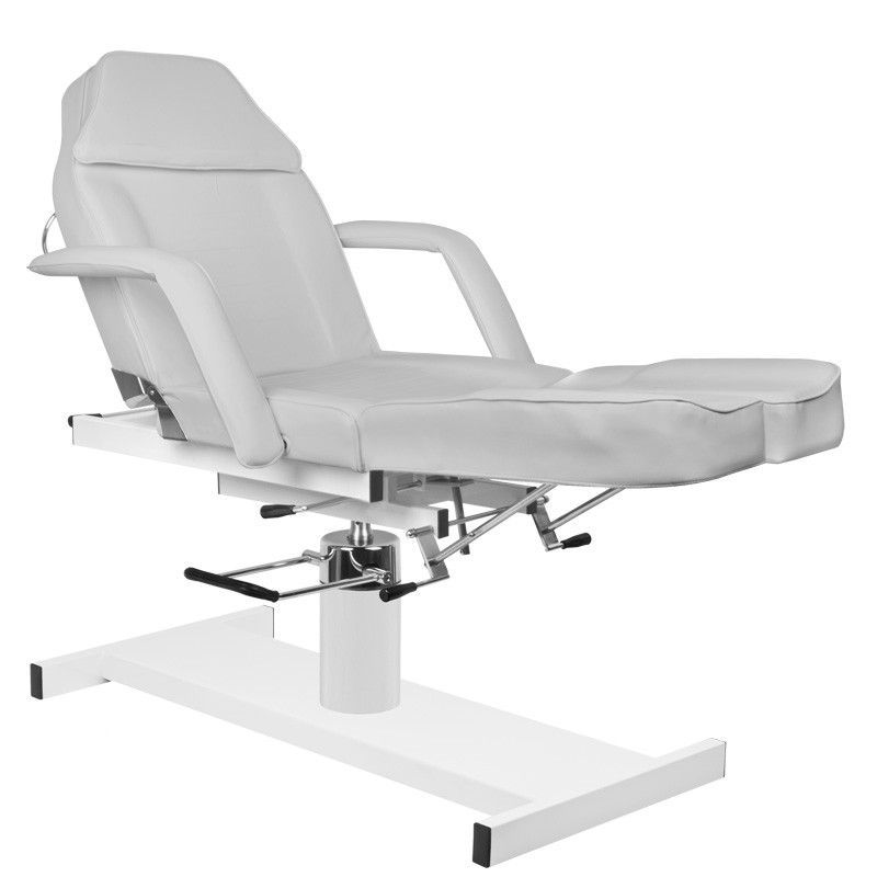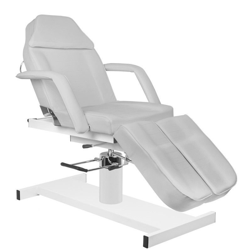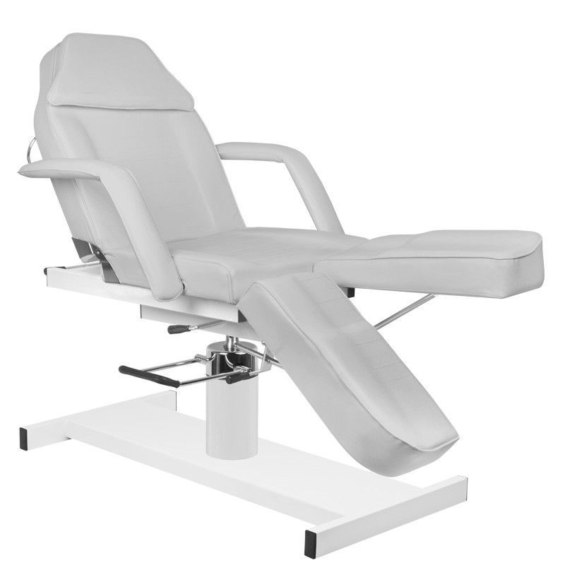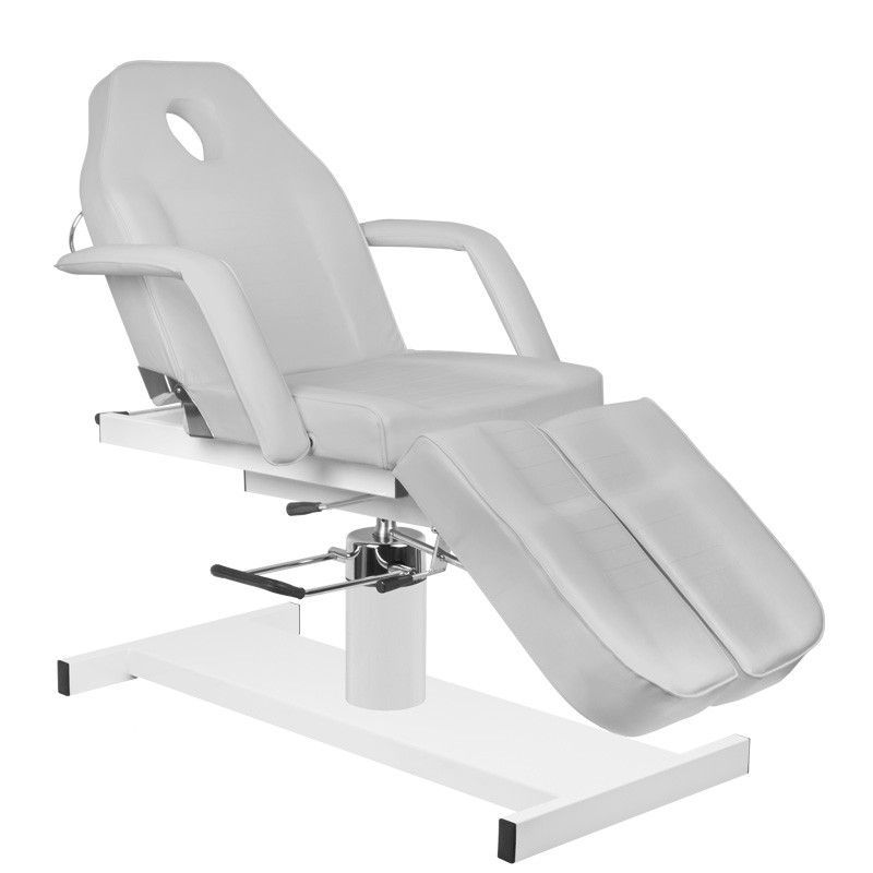Hydraulické kosmetické křeslo A-210C s podnožkou a hydraulickým zvedáním. Otočné křeslo se zámkem, s opěrkami nohou, hydraulickým zvedáním a spouštěním, s otvorem v opěrce hlavy, ideální pro kosmetiku, pedikúru a masáž. Područky jsou odnímatelné, v opěrce hlavy je snímatelná ucpávka. Čalounění křesla je vyrobeno z ekologické kůže, snadno se čistí, splňuje přísné požadavky EU. Estetický vzhled umocňují niklované kovové prvky. Křeslo je k dispozici ve šedé barvě s bílou podstavou.