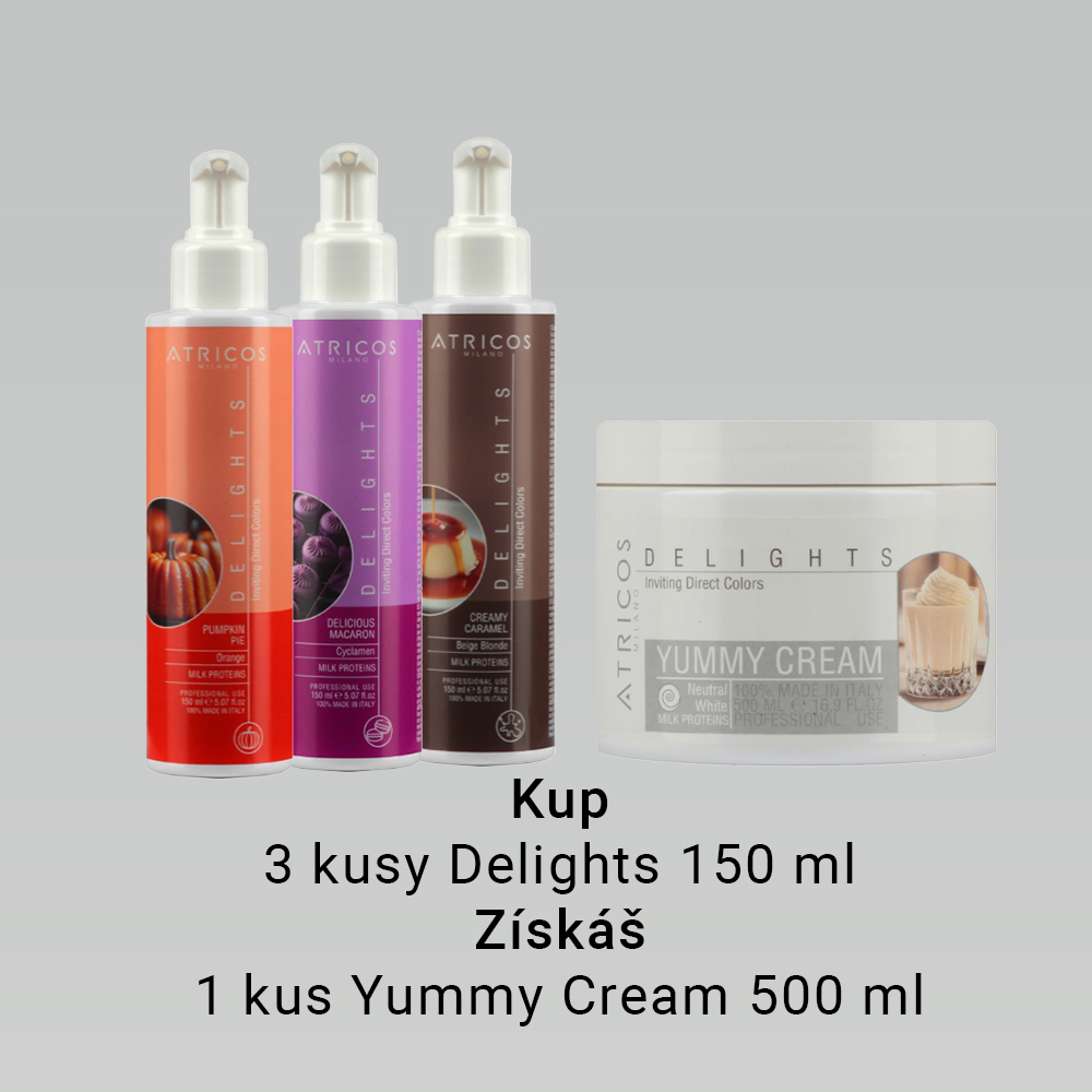 Pro využití této akce zakupte 3 kusy přímých barev Delights 150 ml a jako dárek získáte 1 kus Yummy Cream 500 ml zdarma. Dárek přidáme do zásilky automaticky. Vyberte si zde -> https://www.vseprovlasy.cz/atricos-milano-delights-prime-barvy