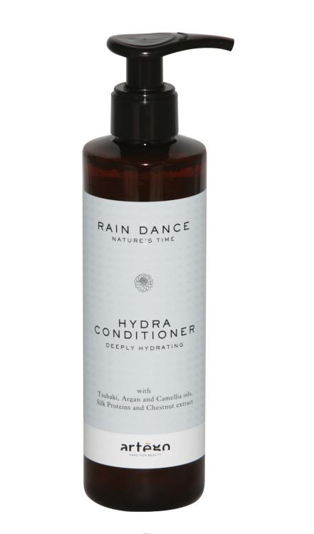 Hydratační krémový kondicionér Artégo Rain Dance Hydra Conditioner je ideální na všechny typy vlasů. Vyživuje vlasy a zanechává je hedvábně měkké a lesklé. Složení obohacené o výtažky z jírovce a hydratující a změkčující oleje hydratuje vlasy a vlasovou pokožku a zanechává je zdravé a hebké. Výtažky z jírovce jsou bohaté na vyživující látky (sacharidy, minerální soli, vitamíny, proteiny a aminokyselin), působí na vlas zvenku tak, že jej pokrývá tenkou vrstvou, opravuje jejich poškození a pomáhá jejich správné hydrataci. Tsubaki olej je čistý produkt, získávaný díky cenným květům kamélie, s neobyčejnými vyživujícími, zklidňujícími, změkčujícími a regeneračními účinky. Unaveným vlasům dodává znovu jejich lesk, vitalitu a měkkost. Arganový olej je bohatý na základní mastné kyseliny, vitamin E, Omega 3 a Omega 6, hluboko vyživuje vlasové kořínky. Působí proti stárnutí, hydratuje, vyživuje a chrání vlasy a vlasovou pokožku. Kaméliový olej je za studena lisovaný přírodní olej bohatý na vitamíny A, B a E. Brání stárnutí a dehydrataci vlasů a vlasové pokožky. Hedvábné proteiny z vlákna bource morušového, vytváří tenkou ochrannou vrstvu, která chrání vlasy, zajišťuje hydrataci a měkkost na dotek díky své schopnosti vázat se s vodou.