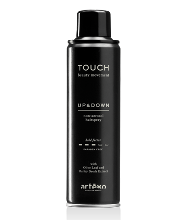Artégo Touch Up And Down Hairspray je středně tužící lak na vlasy bez plynu. Chrání vlasy před vlhkostí. Dodává vlasům objem a lesk, aniž by je zatěžoval. Po aplikaci je možné vlasy opět modelovat. Nezanechává usazeniny a zbytky ve vlasech. Lze jej odstranit z vlasů několika tahy kartáče. Lak voní po tonkových bobech, akcentech broskve a meruňky.