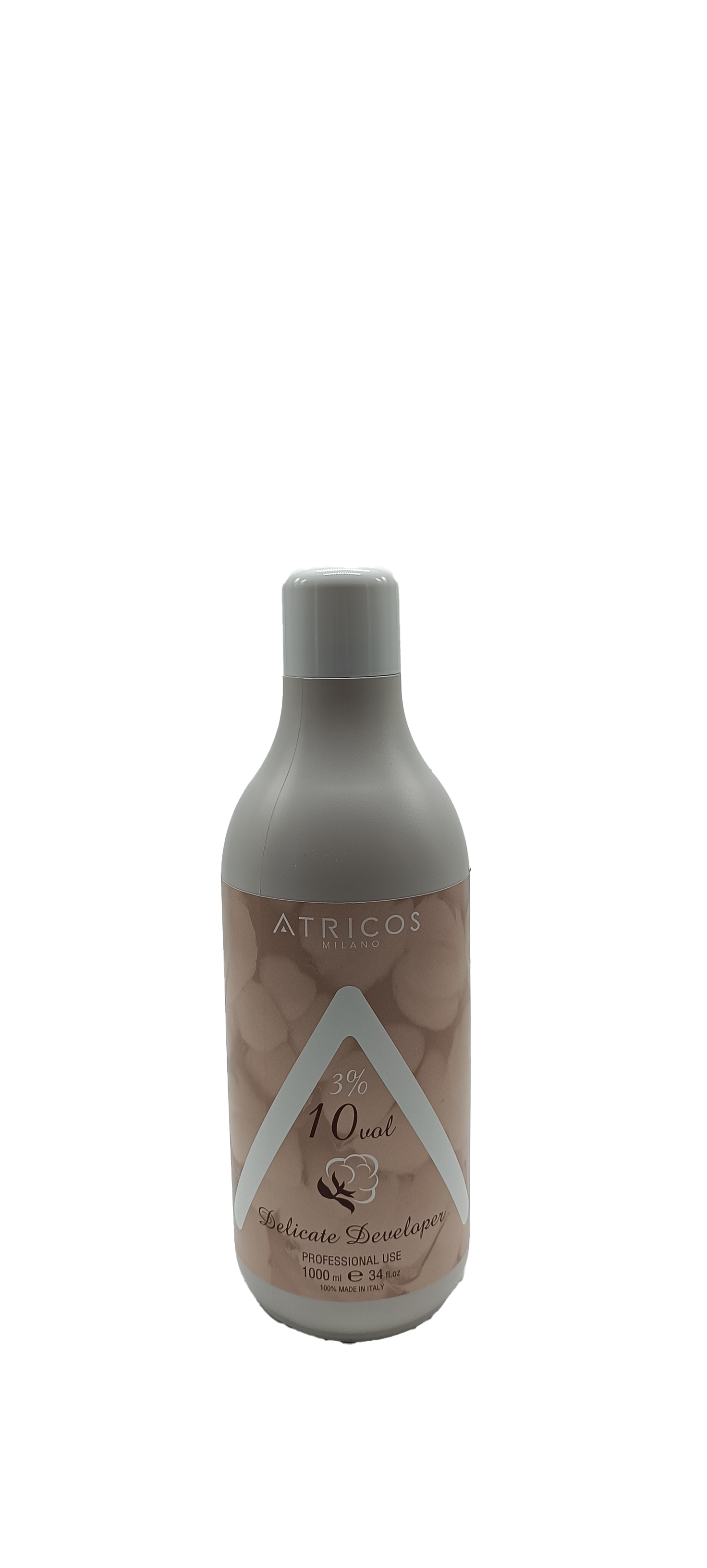 Neparfemovaný emulgovaný peroxid vodíku v 10 Vol. 3%., který má neinvazivní oxidační vlastnosti. Jeho konzistence je tekutá a krémová. Nezbytný pro barvení v kombinaci s barvami na vlasy Atricos Delicate, Zajišťuje stálost síly peroxidu i po otevření láhve a zaručuje vynikající výkon.
