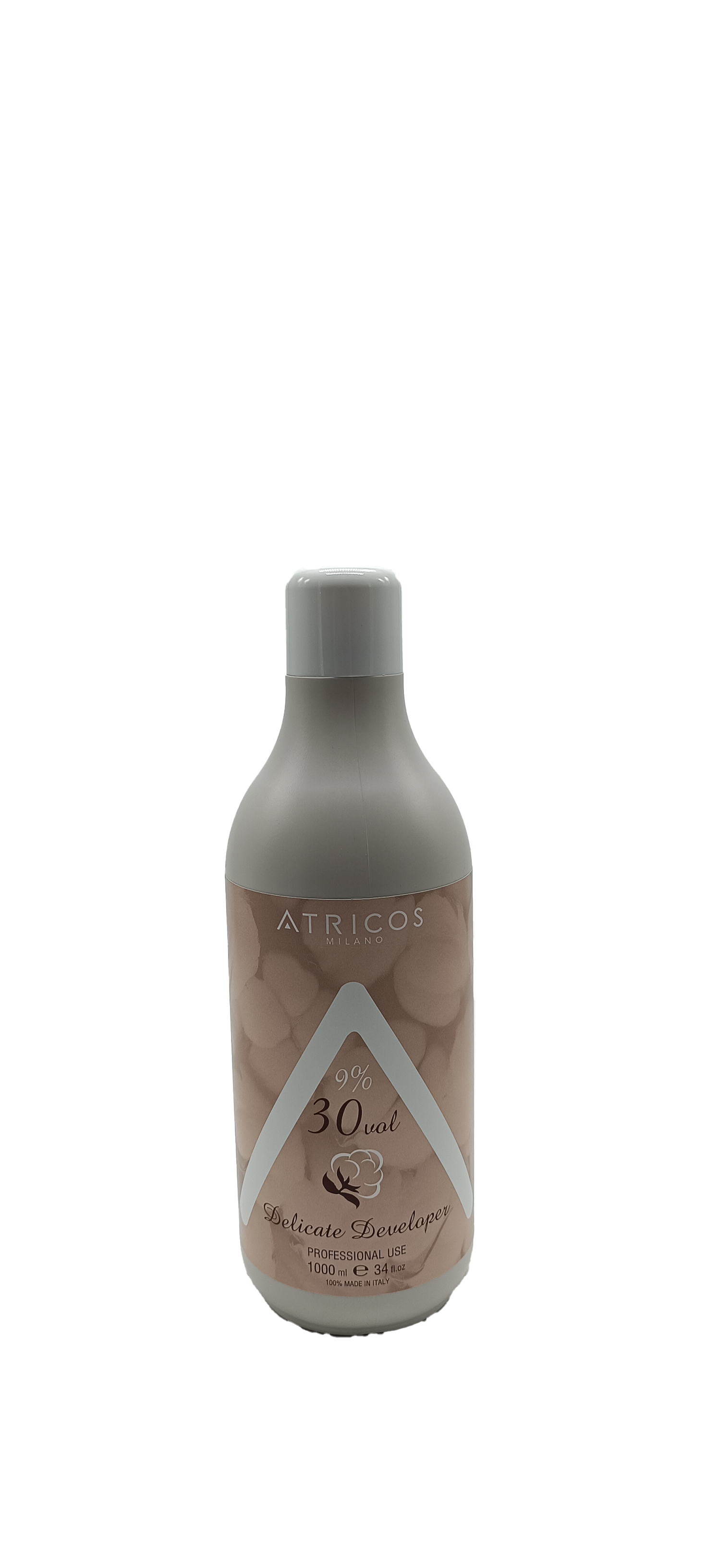 Neparfemovaný emulgovaný peroxid vodíku v 30 Vol. 9%., který má neinvazivní oxidační vlastnosti. Jeho konzistence je tekutá a krémová. Nezbytný pro barvení v kombinaci s barvami na vlasy Atricos Delicate, Zajišťuje stálost síly peroxidu i po otevření láhve a zaručuje vynikající výkon.