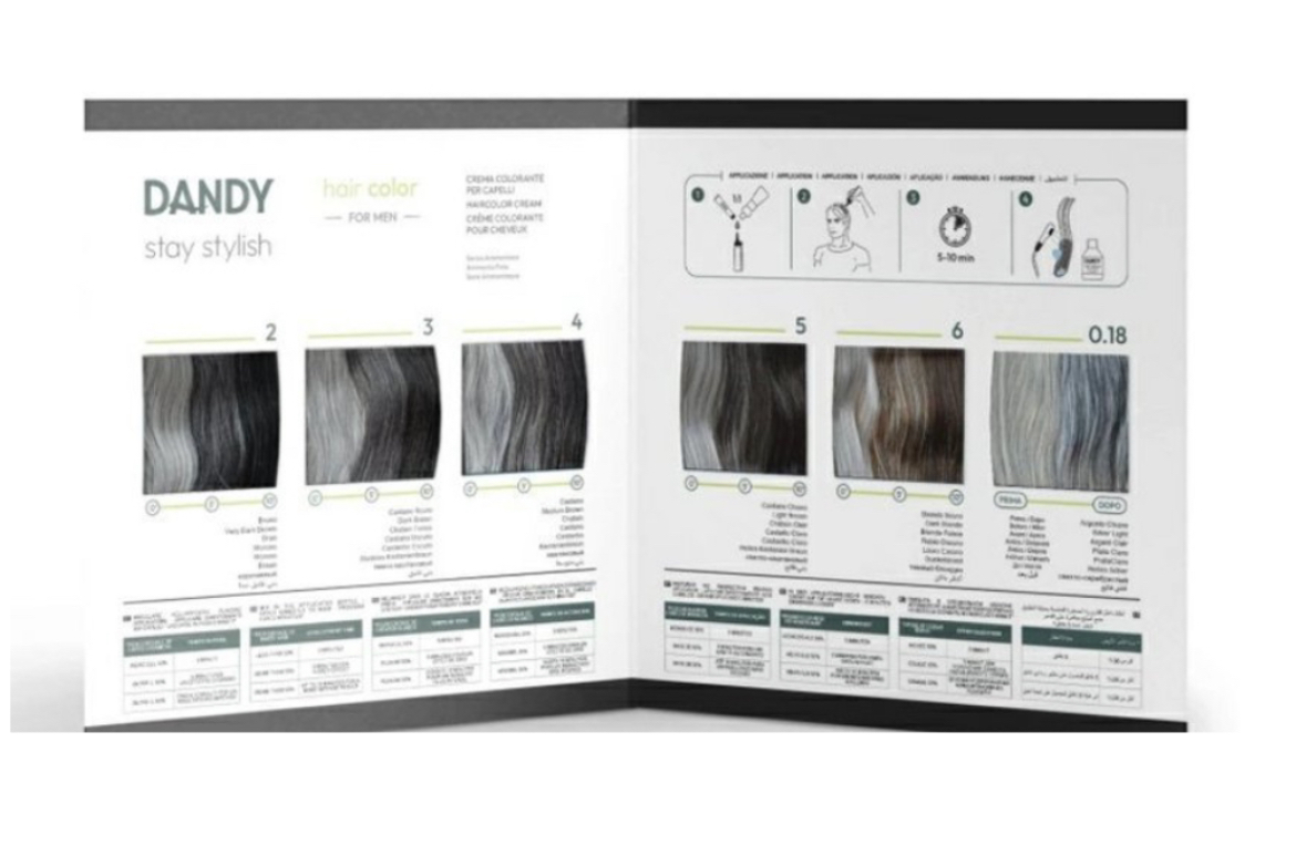 Bezamoniaková pánská barva na vlasy značky Dandy. Zajišťuje přírodní krytí šedin.