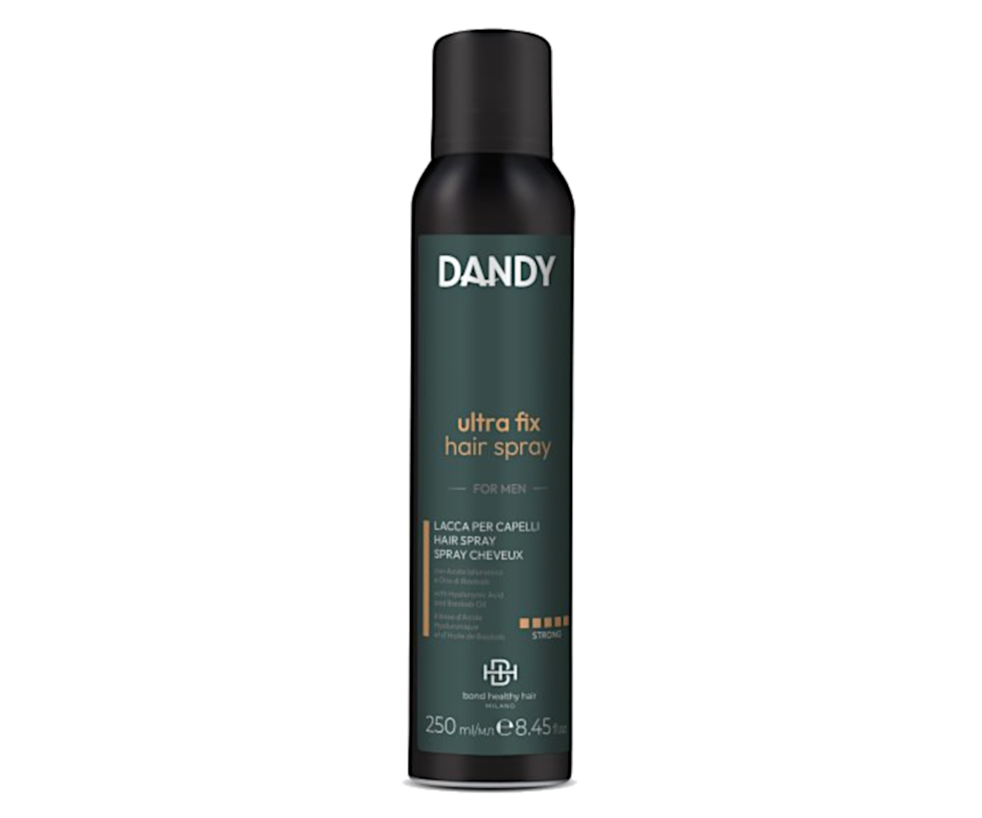 Dandy Beard & Hair Ultra Fix Hair Spray je jedinečný pánský lak na vlasy, který je ideální pro vytvarování jakéhokoli účesu na každý den. Jedinečná receptura obsahuje speciální formuli Extra Dry s minimálním podílem vody, díky němuž je lak vhodný i pro vytváření odvážnějších účesů s dlouhotrvajícím účinkem. Kyselina hyaluronová a olej z baobabu, který lak také obsahuje, vlasy neustále posilují a chrání před negativními vlivy. Lak tedy zajišťuje dokonalý tvar účesů včetně ochrany před vlhkostí a má příjemnou decentní vůni.