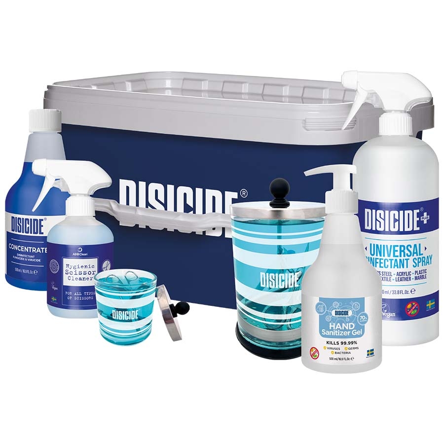 Značka Disicide představuje sadu obsahující dezinfekční přípravky pro kadeřnické provozovny a barber shopy. V sadě naleznete 5 prostředků pro dezinfekci prádla, povrchů a nástrojů. Neobsahuje alkohol.