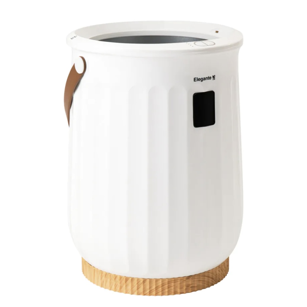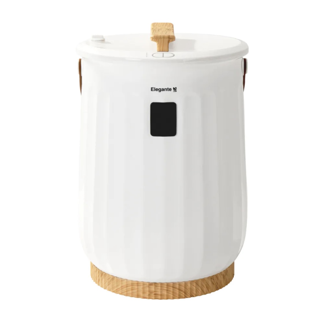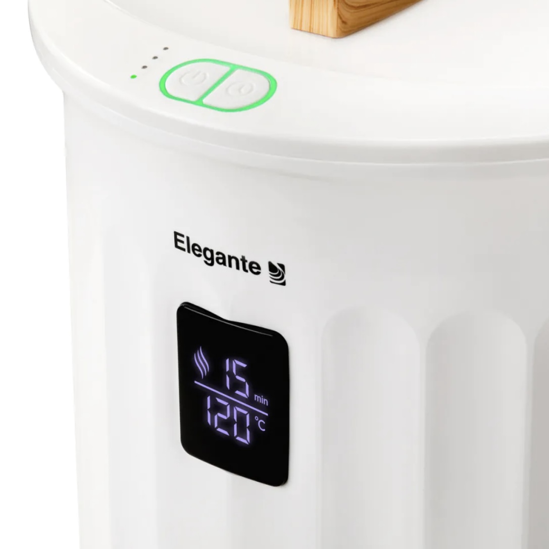 Elegante E18 ohřívač ručníků umožňuje nahřát dva velké ručníky současně. Díky unikátní konstrukci ve tvaru kbelíku zajišťuje přístroj rovnoměrné rozložení tepla po celé ploše. Ohřívač je vybaven displejem, popruhem na přenášení a kotoučem na aromaterapii. Zařízení se rychle zahřívá, takže je během krátké doby připraveno k provozu. Ohřívač má funkci časovače, to umožňuje nastavit dobu provozu na: 15, 30, 45 nebo 60 minut, po kterých je ohřev ukončen. Přehledný displej odpočítává zbývající čas a ukazuje teplotu uvnitř zařízení. Funkce automatického vypnutí umožňuje šetřit energii - 30 minut po skončení odpočítávání a vypnutí topení se automaticky vypne i displej. Plášť ohřívače je vyroben z bílého plastu. Vizuálně příjemným doplňkem jsou estetické drážky a dekorativní prvky imitující dřevo. LED kontrolka kolem tlačítek informuje o provozním stavu ohřívače, zatímco kontrolní dioda indikuje zvolenou dobu provozu.
