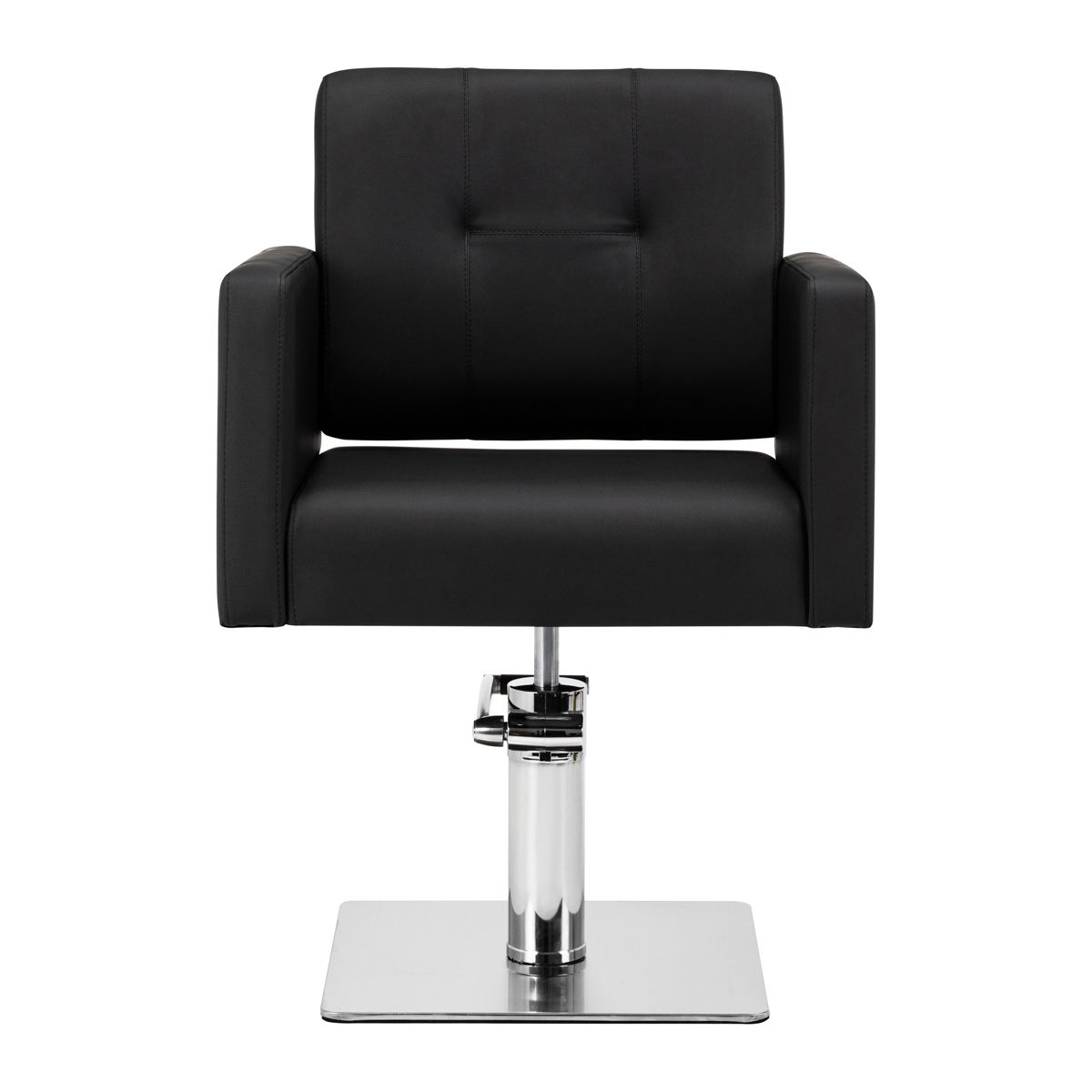 Klasické, pohodlné černé kadeřnické nebo holičské křeslo Bergamo . Má hydraulickou bázi, která umožňuje nastavit výšku židle.