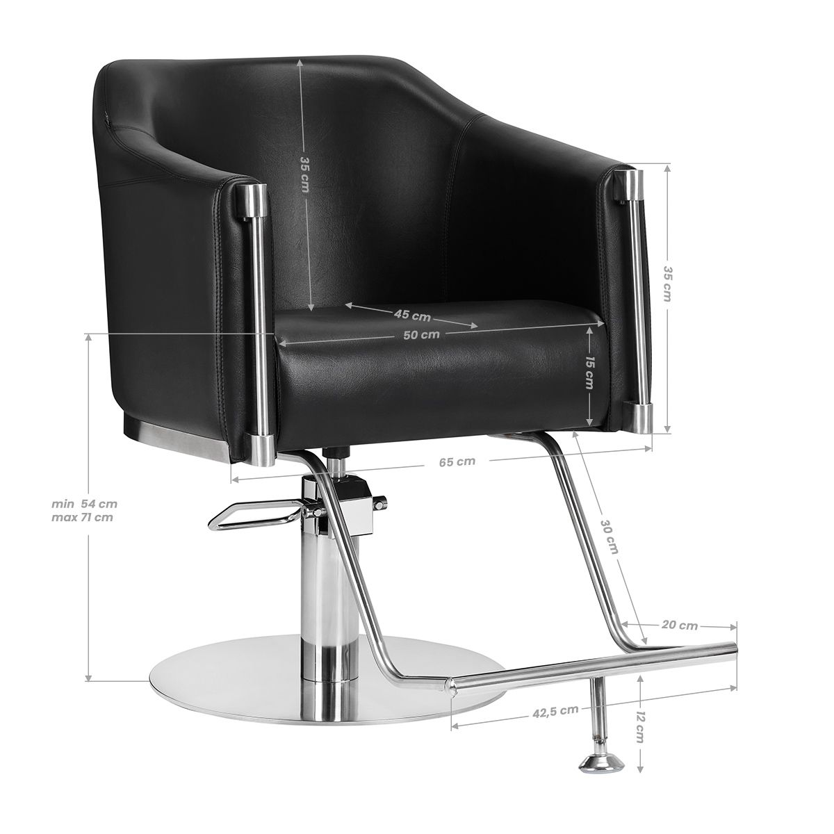 Odolný hydraulický zdvih umožňuje nastavit výšku sedadla v rozmezí 54-71 cm, i když klient sedí na židli. To zaručuje ergonomičtější práci díky možnosti nastavení výšky dle výšky klienta i kadeřníka. Správně profilovaná zaoblená zádová opěrka umožňuje zaujmout pohodlnou polohu, což je důležité zejména v případě mnohahodinových úkonů. Podstatnou výhodou je tomuto modelu přizpůsobená podnožka, která poskytuje stabilní oporu nohám zákazníka.