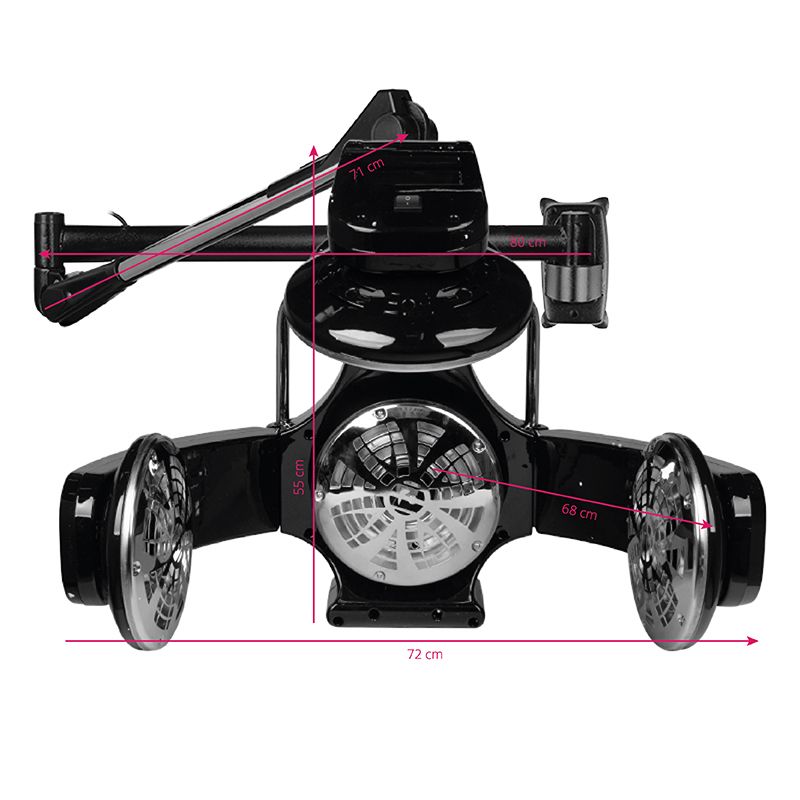 Infrazon pro kadeřnický salon s 5 termo hlavicemi a 5. ventilátory. Má elektronický panel pro snadné nastavení parametrů s přednastavenými programy. Je umístěn na rameni, díky čemuž nezabírá místo v salonu. S tímto designovým přístrojem výrazně zkvalitníte a rozšíříte služby ve Vašem salonu. Přístroj dokáže urychlit proces barvení, zesvětlování nebo trvalé. Je perfektním pomocníkem při regeneracích vlasů, nebo při dnes velmi oblíbeném čištění vlasů.