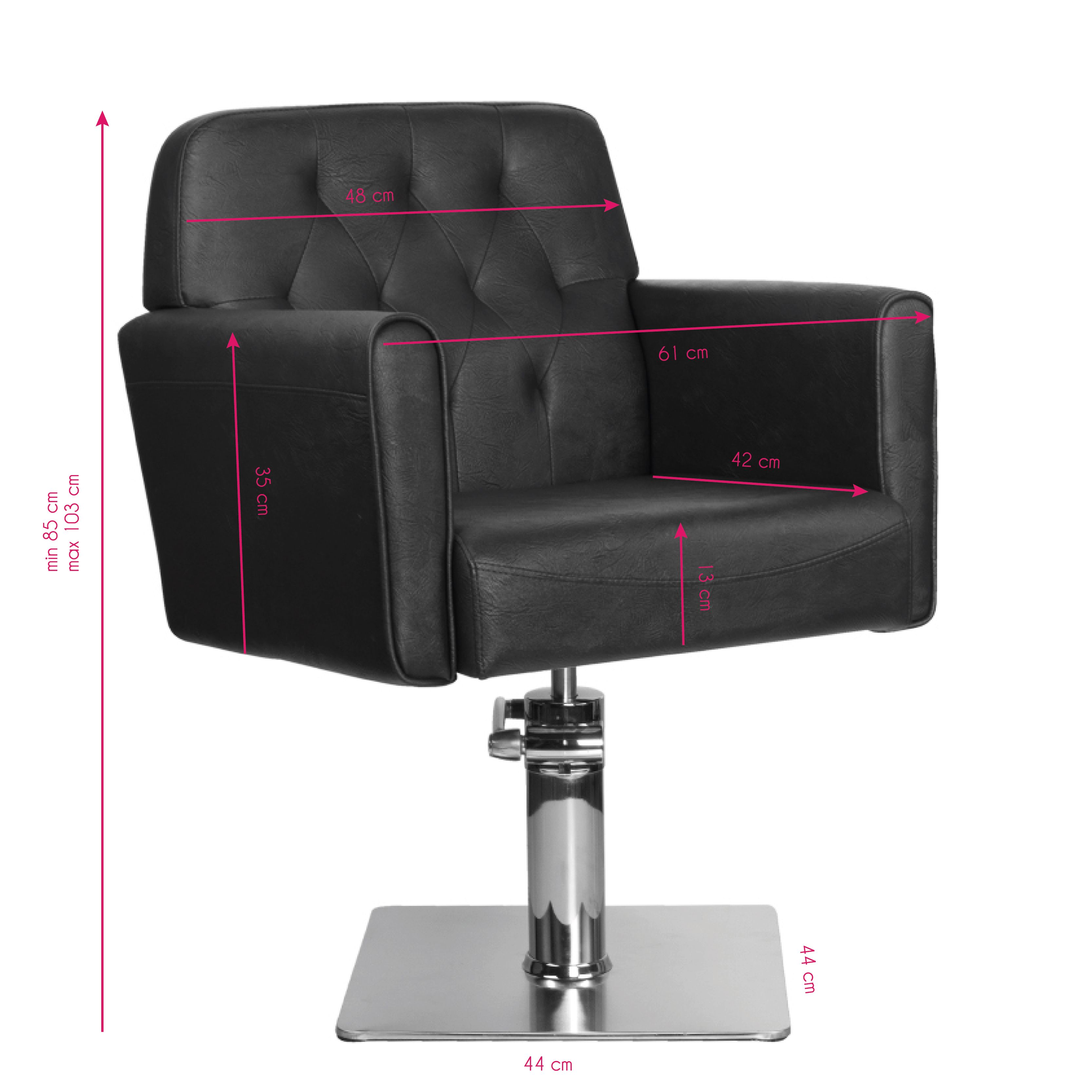 Kadeřnické křeslo Hamburg stylové kadeřnické křeslo, které je velmi pohodlné, perfektně se hodí do interiérů elegantních kadeřnických salonů. Elegantní prošití knoflíky působí velmi efektně. Křeslo lze nastavit ve svislé rovině pomocí hydraulické báze. Křeslo je velmi stabilní a pevné. Díky čalounění z černé ekokůže je u křesla snadná údržba. Čtvercová základna z kvalitní oceli Inox doplňuje eleganci této židle.
