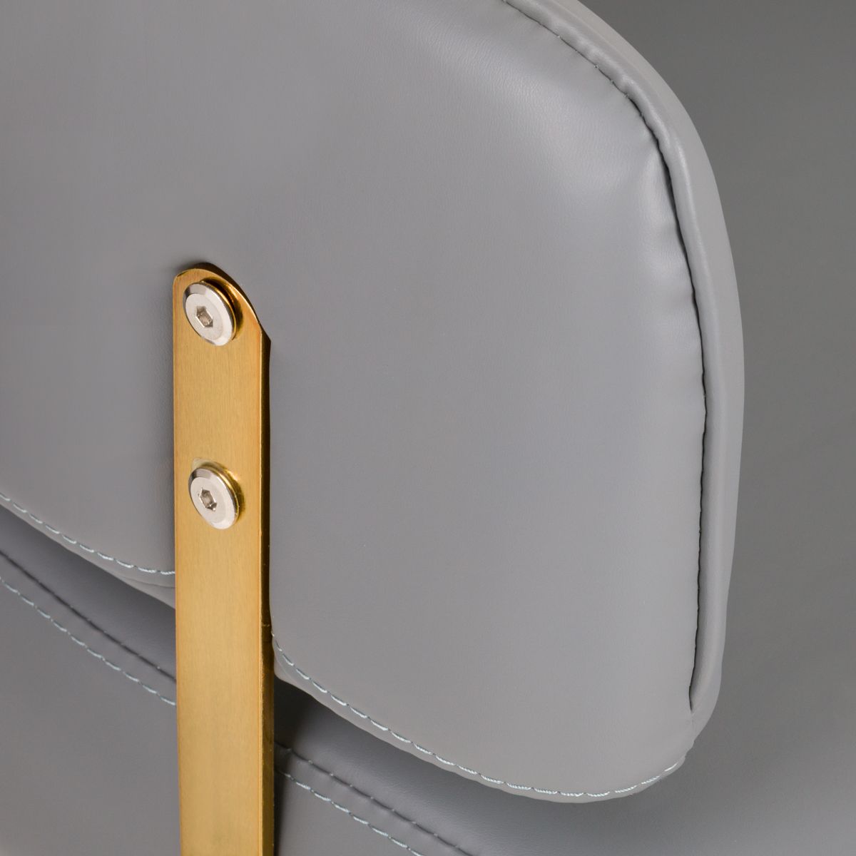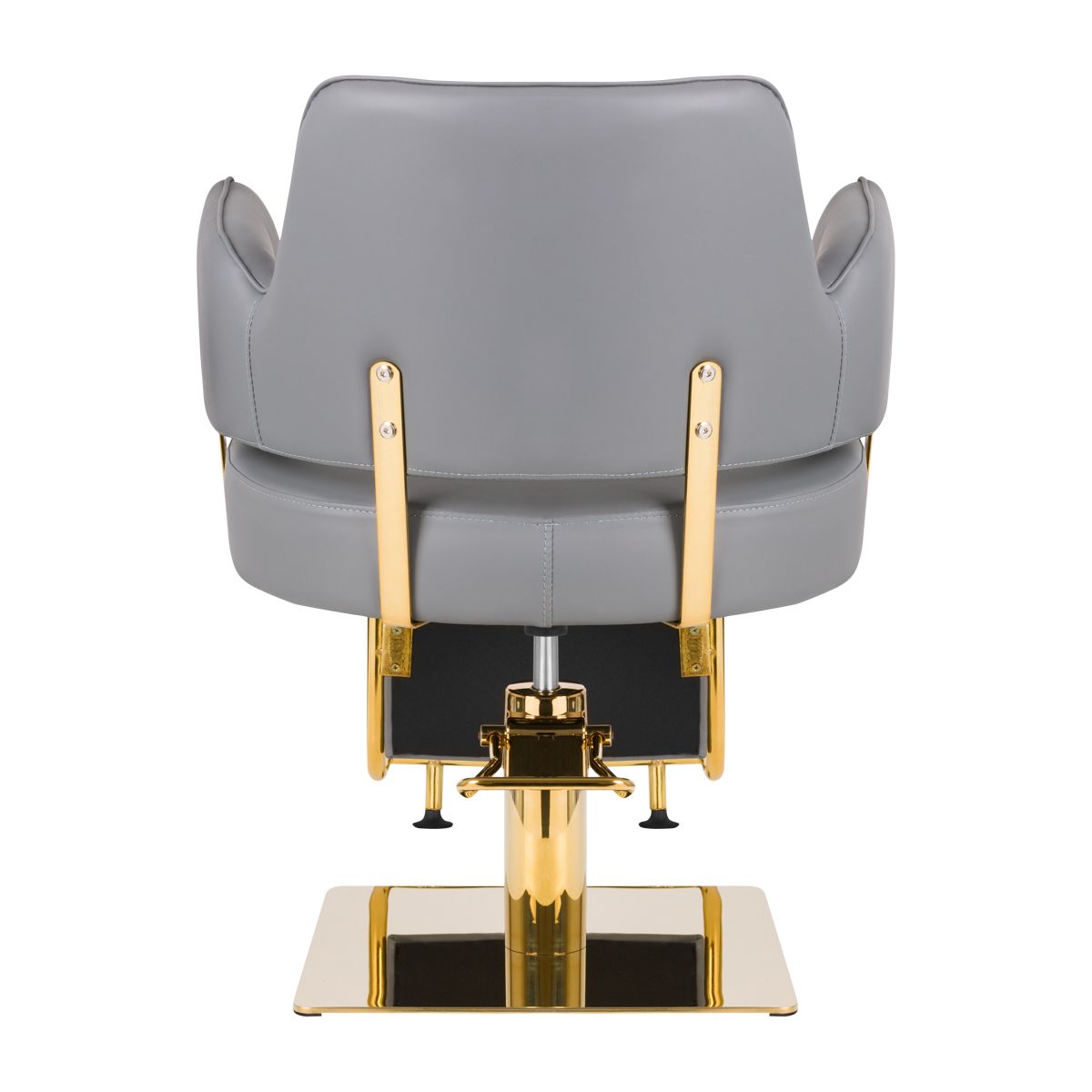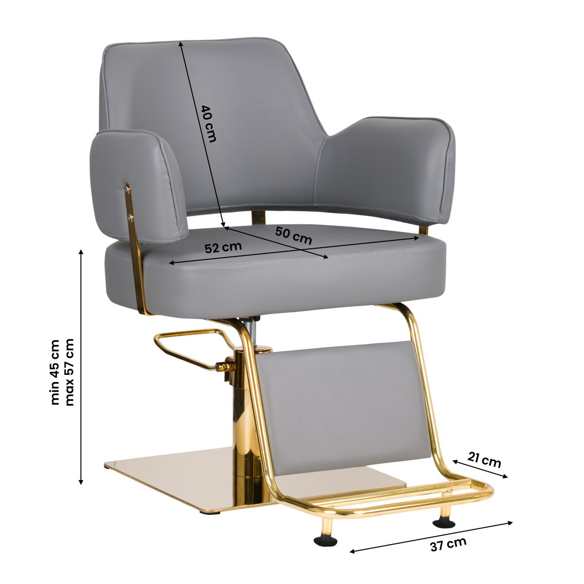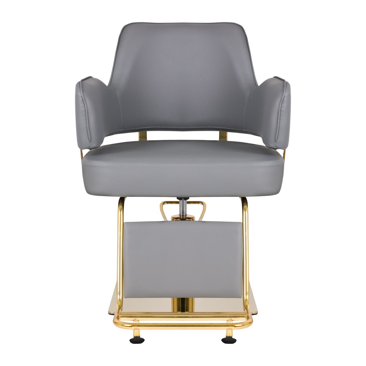 Moderní kadeřnické křeslo s podnožkou s jedinečným designem. Velmi pohodlné, ideální do moderních salonů. Speciálně tvarované, aby klientovi poskytlo pohodlnou polohu během procedury. Nastavitelné ve vertikální rovině díky hydraulické bázi. Velmi stabilní a pevné. Potah vyrobený z vysoce kvalitní ekokůže. Šedá barva se zlatými prvky dodává křeslu čistou eleganci.