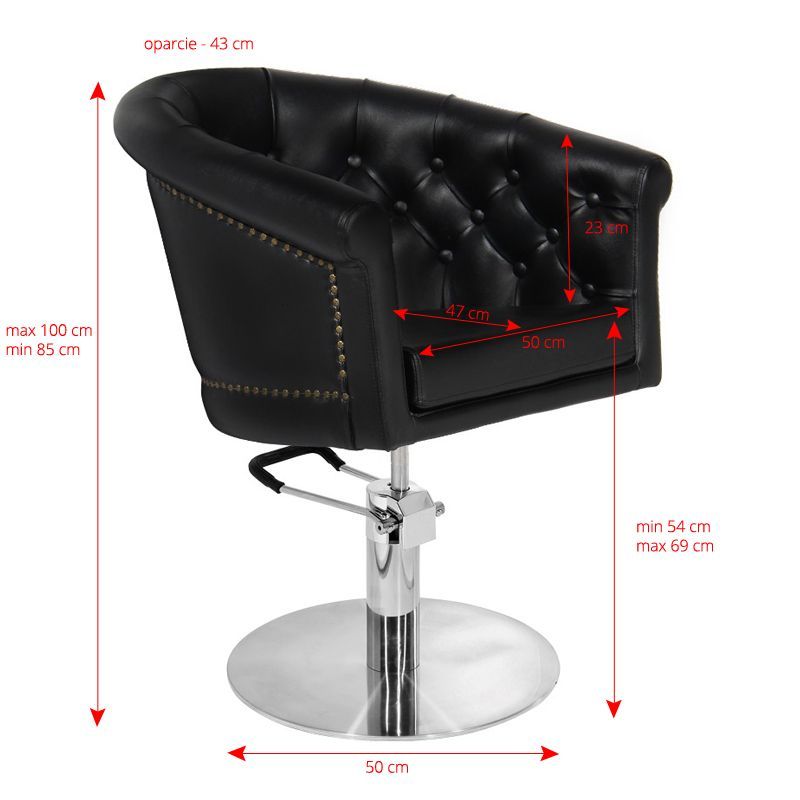 Stylové kadeřnické křeslo. Velmi pohodlné, ideálně se hodí do interiérů elegantních kadeřnických salónů. Nastavitelné ve svislé rovině díky hydraulické bázi. Velmi stabilní a pevný kadeřnický nábytek. Potah je vyroben z nejkvalitnější černé ekokoženky. Eleganci tohoto křesla doplňuje kulatý podstavec z vysoce kvalitní oceli Inox kruhového tvaru.