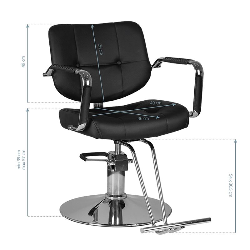 Židle s moderním designem vhodná do holičských a kadeřnických salonů, velmi pohodlná, perfektně doplní vzhled moderního interiéru. Speciálně tvarovaná tak, aby poskytovala klientovi pohodlnou polohu během kadeřnické služby. Nastavitelná ve svislé rovině, stabilní a pevná. Potah je vyroben z kvalitní černé eko kůže, snadno se udržuje v čistotě.