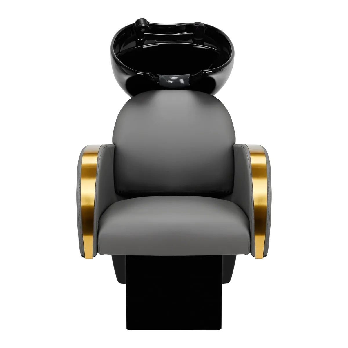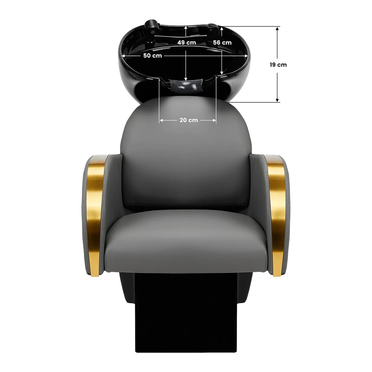 Moderní kadeřnický mycí box Gabbiano spojuje funkčnost s italskou elegancí. Mycí box je vyroben z nejkvalitnějších materiálů a plně splňuje požadavky moderního kadeřnictví. Měkký a extrémně pohodlný sedák je potažen kvalitní ekokůží šedé barvy. Mycí box jako takový je kompletně vybaven pro použití v kadeřnickém salonu. Umyvadlo je naklápěcí a je osazeno sprchou, odpadem a baterií. Jedná se stabilní a pevný mycí box od kvalitního výrobce.