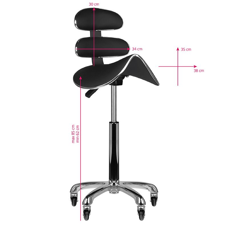 Pohodlný, stabilní kosmetický taburet s tvarovaným sedákem a ergonomickým opěradlem. Je namontován na pětihvězdičkovém podstavci se senzační gumou a kolečky Roll Speed s kuličkovými ložisky, které zaručují snadný pohyb. Vyrobeno z ekokoženky v černé barvě.