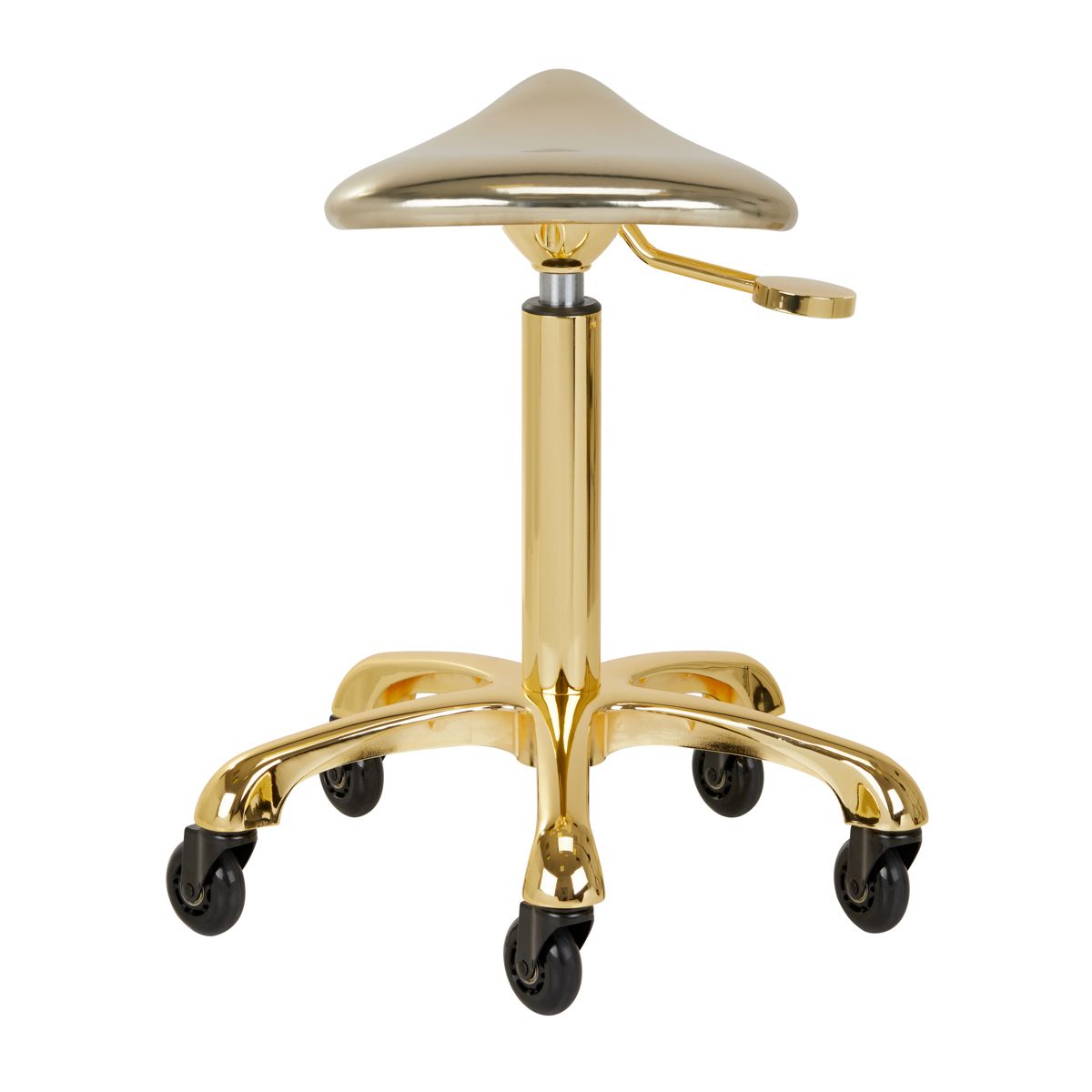 Luxusní taburet s unikátní povrchovou úpravou. Kadeřnická stolička Gabbiano Fine Gold zaujme svým jedinečným vzhledem. Sedák je vyroben z lesklé kůže imitující kov a je vhodně profilován, což zajišťuje komfort práce i při dlouhém ošetřování. Výškové nastavení umožňuje přizpůsobit nábytek individuálním potřebám uživatele.