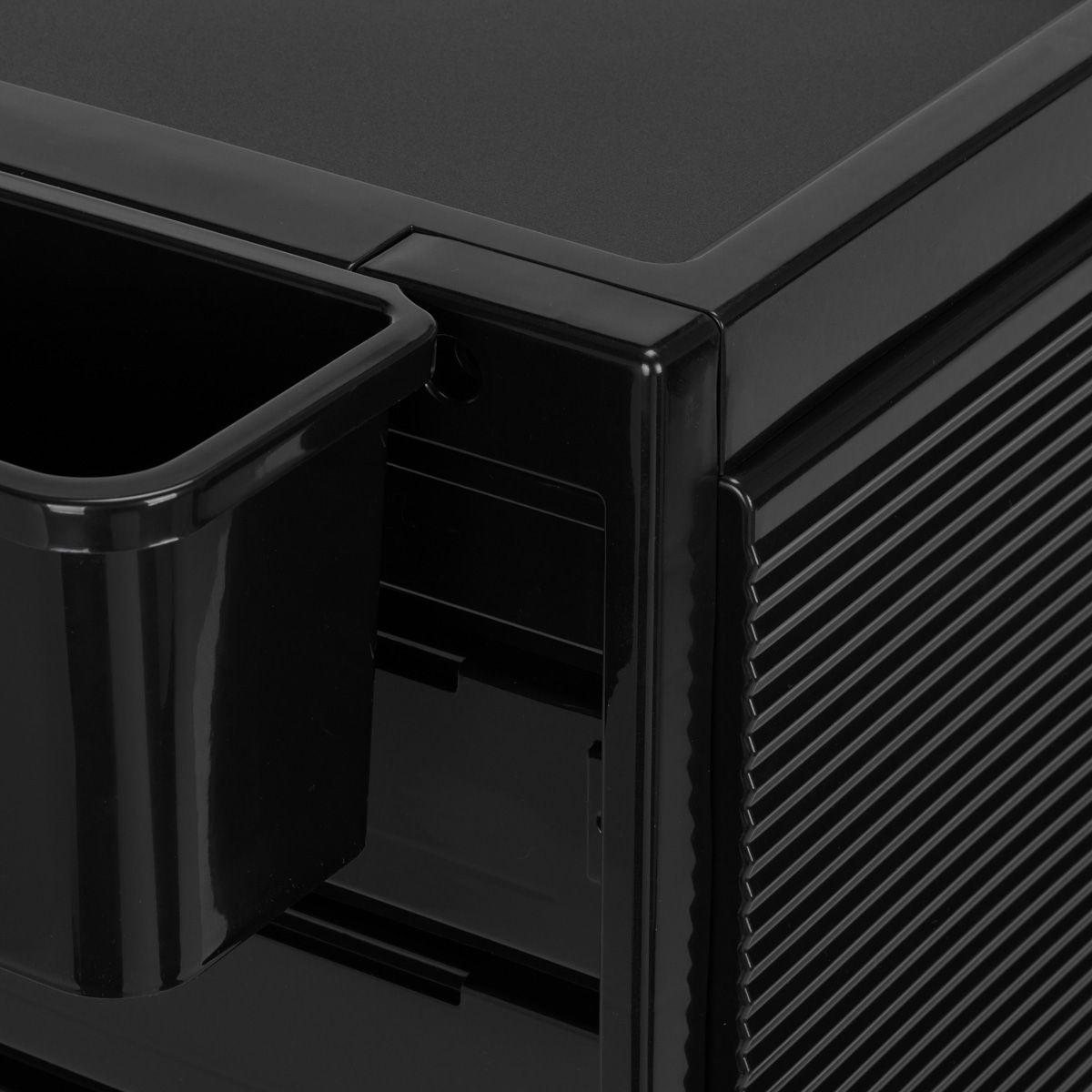 Kadeřnický vozík v černé barvě, má 5 šuplíků pro kadeřnický sortiment. Stabilní konstrukce zajistí dlouhodobé používání. Kadeřnický vozík je upevněn na gumových kolečkách, díky nimž budete mít nářadí…