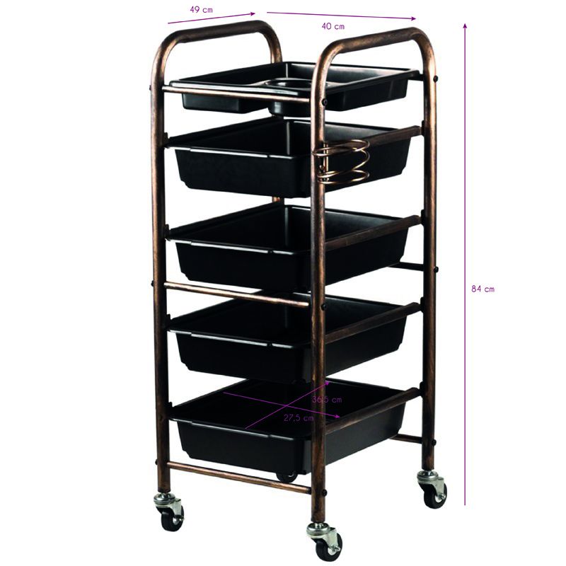 Oboustranný kadeřnický pomocník v barvě starého zlata, má čtyři zásuvky a úchyty pro kadeřnický sortiment.Pevná konstrukce zajistí dlouhodobé používání. Stůl je namontovaný na gumových kolech, takže se s ním dle potřeby snadno manipuluje a nástroje máte vždy po ruce.