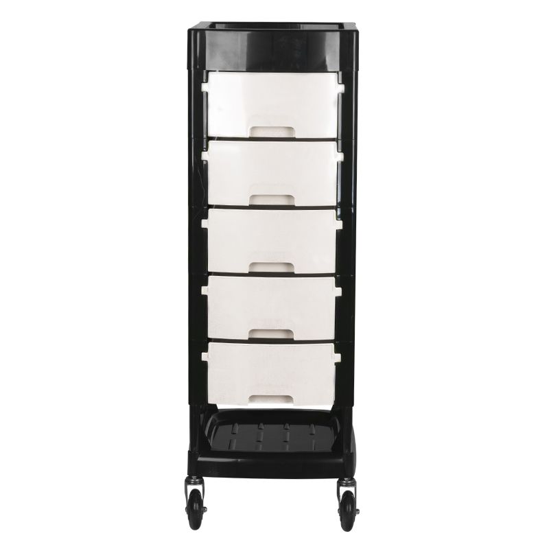 Gabbiano kadeřnický úložný stolek FT65 černo/bílý který je vyroben z odolného plastu ABS s ocelovou rámovou konstrukcí zajišťující vysokou stabilitu a odolnost. Stolek je opatřen gumovými kolečky, takže je mobilní a snadno se s ním manipuluje. Dominantní černá barva doplněna bílou barvou pěti zásuvek se bude vyjímat ve vašem moderním salonu.