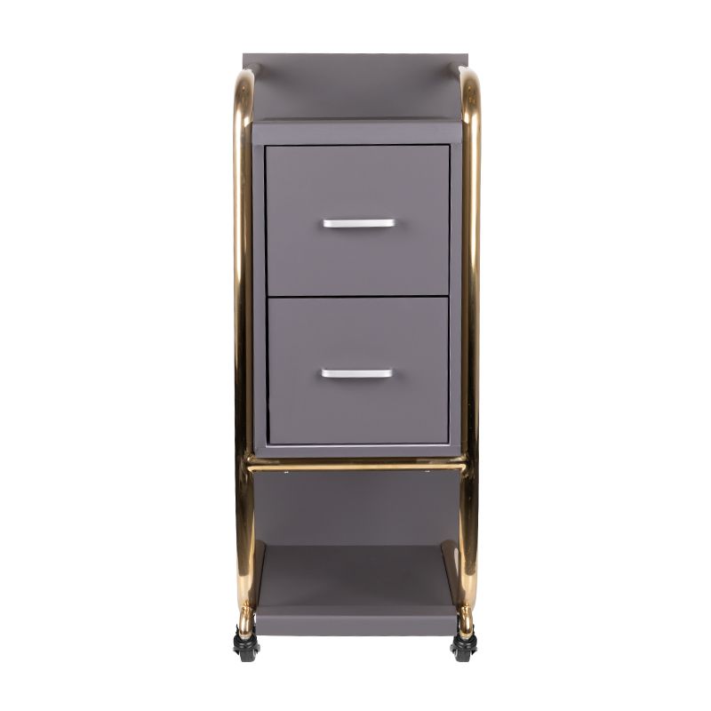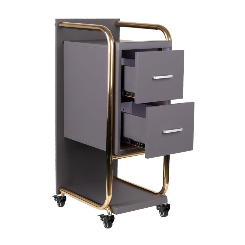 Vysoce kvalitní kadeřnický vozík, pomocník, Gabbiano Solo, ocelová konstrukce s tělem z dřevěných desek. Má dvě zásuvky a pogumovaná kolečka s brzdami.