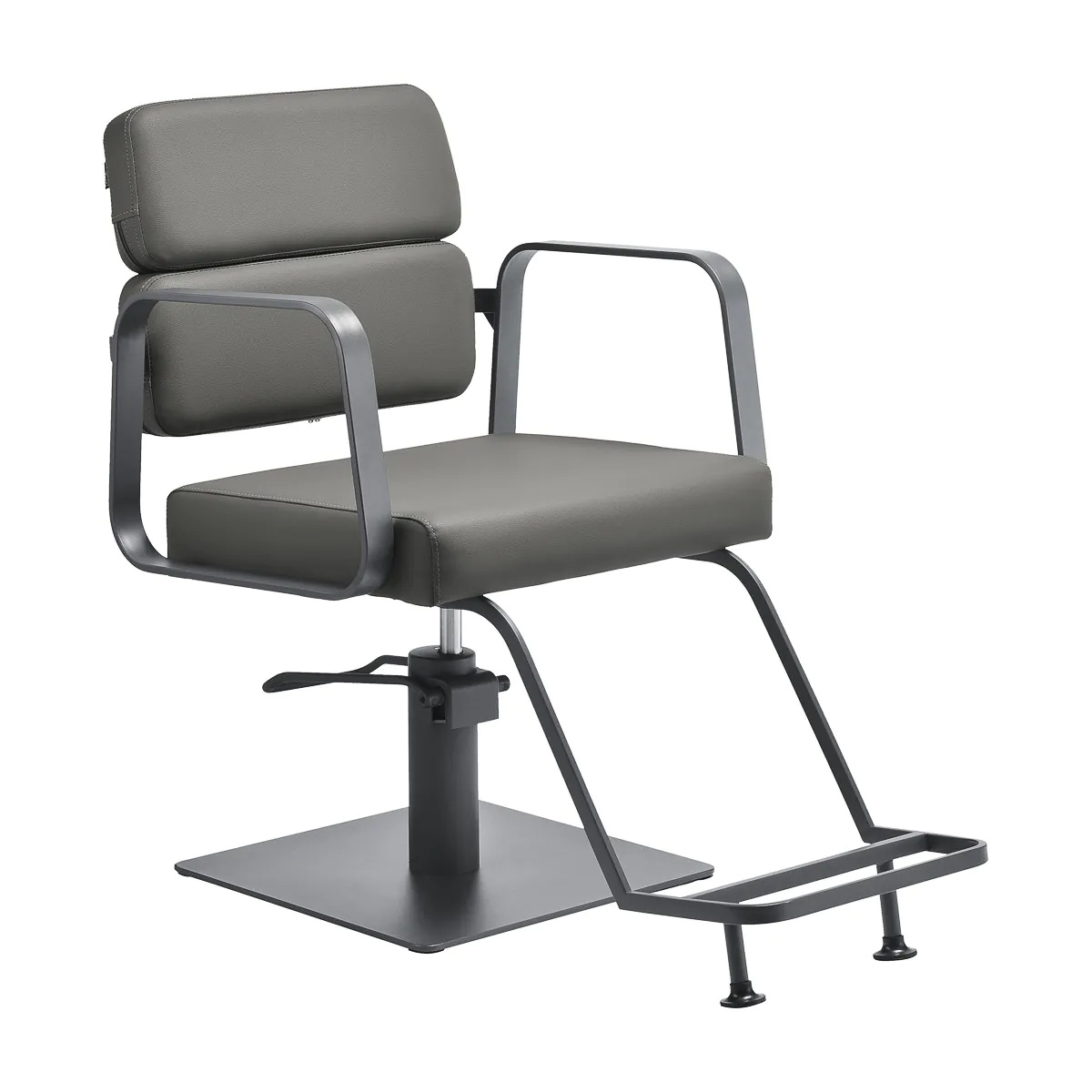 Plně otočný mechanismus, kterým je židle vybavena, zefektivňuje a zpříjemňuje práci kadeřníka. Pevná plochá základna čtvercového tvaru zaručuje stabilitu při používání. Matný, hladký povrch dodává křeslu elegantní vzhled a díky němu se toto křeslo snadno udržuje v čistotě. Pohodlné sedadlo s pěnovou výplní zajišťuje vysokou úroveň komfortu i při dlouhém používání. Geometrické kovové područky umožňují správnou polohu ramen klienta a znatelně tak usnadňují precizní ošetření, včetně stříhání vlasů. Stylová opěrka nohou určená pro tento model poskytuje stabilní oporu pro nohy uživatele.