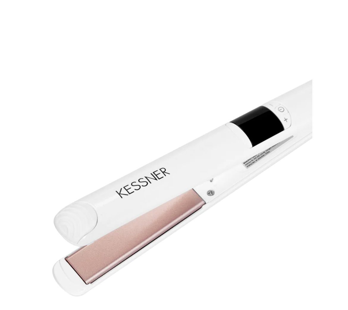 Profesionální žehlička na vlasy Kessner s ionizací a kvalitními plovoucími destičkami, které jsou potažené keramicko-turmalínovým povlakem.