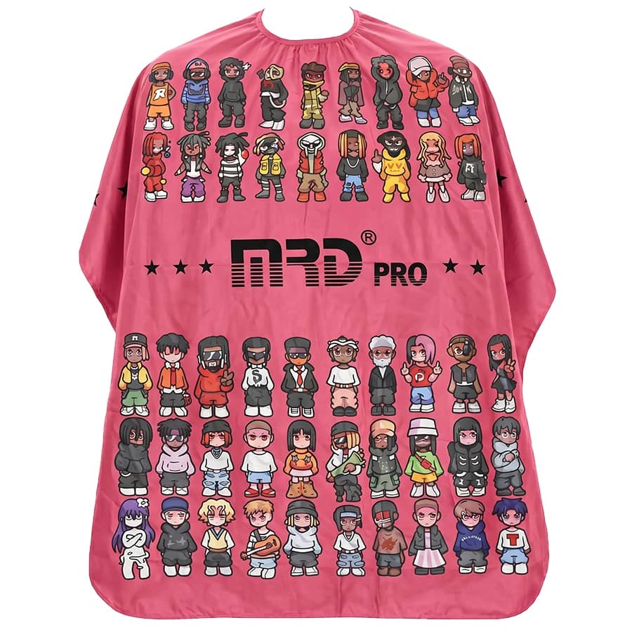 Barber pláštěnka pro zákazníka z antistatického materiálu od značky MRD Pro. Zabraňuje přichytávání vlasů k látce. Díky voděodolné úpravě zvládne pláštěnka šamponování, umývání bez propuštění vody na oblečení. Pláštěnka má nastavitelné pružné zapínání na krku, pro správné přizpůsobení každému klientovi. S motivem animovaných postaviček. V růžové barvě.