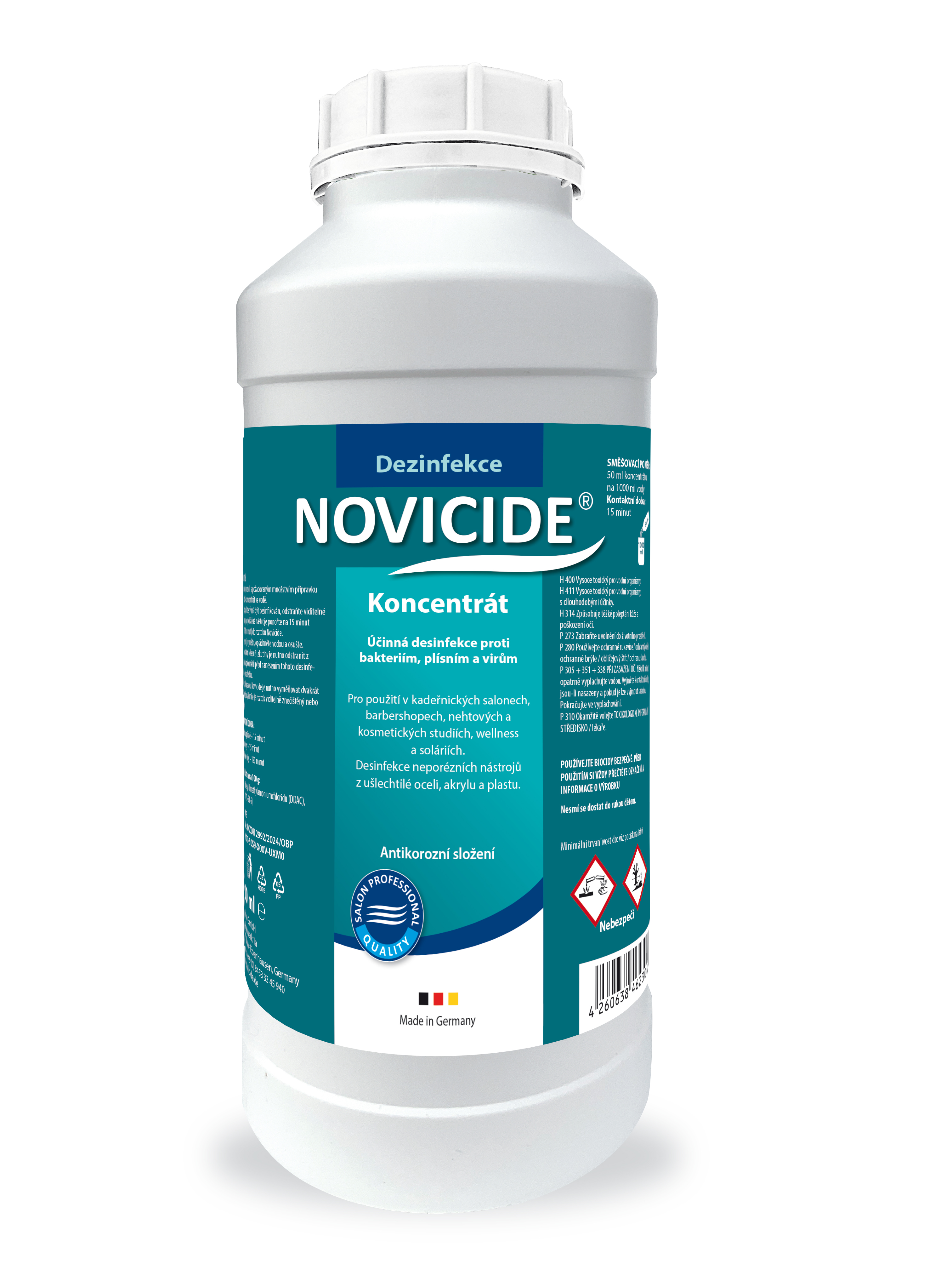 Plnospektrální koncentrát k dezinfekci nástrojů od značky Novicide. Vydezinfikuje nůžky, hřebeny, holící strojky a manikúrní nástroje.