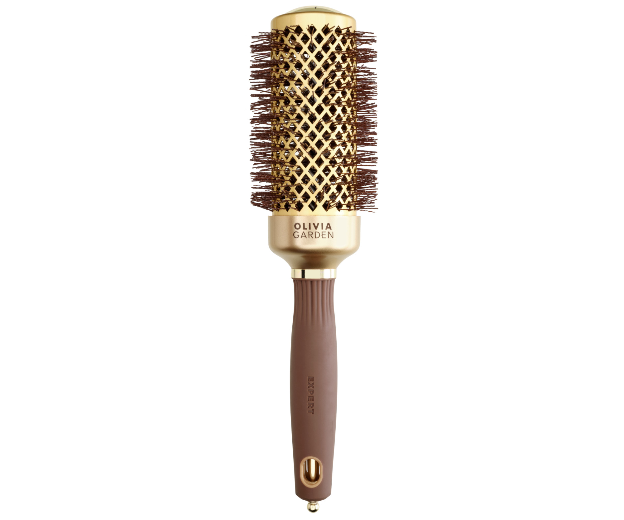 Profesionální kulatý kartáč na vlasy Olivia Garden Expert Shine Wavy Bristles Gold & Brown. Technologie Tourmaline Ion dodává vlasům lesk a zabraňuje jejich elektrizování. Kartáč má antibakteriální ochranu a v ergonomicky tvarované pogumované rukojeti je vsazen výsuvný hrot na vypichování pramenů vlasů. Keramické tělo kartáče a vzduchové otvory rovnoměrně a v krátkém čase zajistí přenos tepla z fénu k vlasům. Měkké a odolné štětiny z nylonu jsou speciálně zakroucené, takže jsou velmi šetrné k vlasům i k vlasové pokožce.