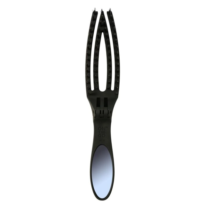 Cestovní skládací kartáč On The Go od značky Olivia Garden. V černém provedení. Vhodný pro každodenní použití a pro všechny typy a délky vlasů. Díky kompaktnímu a skládacímu designu je ideální pro cestování. Jednoduše ho přibalíte s sebou do tašky. Na kartáči je umístěné zrcátko pro jednodušší úpravu účesu a celkového vzhledu. Kartáč má antistatické nylonové a kančí štětiny, které eliminují elektrizování vlasů. Štětiny uhlazují vlasy, napomáhají s jejich rozčesáváním a zároveň dodávají vlasům objem a lesk.