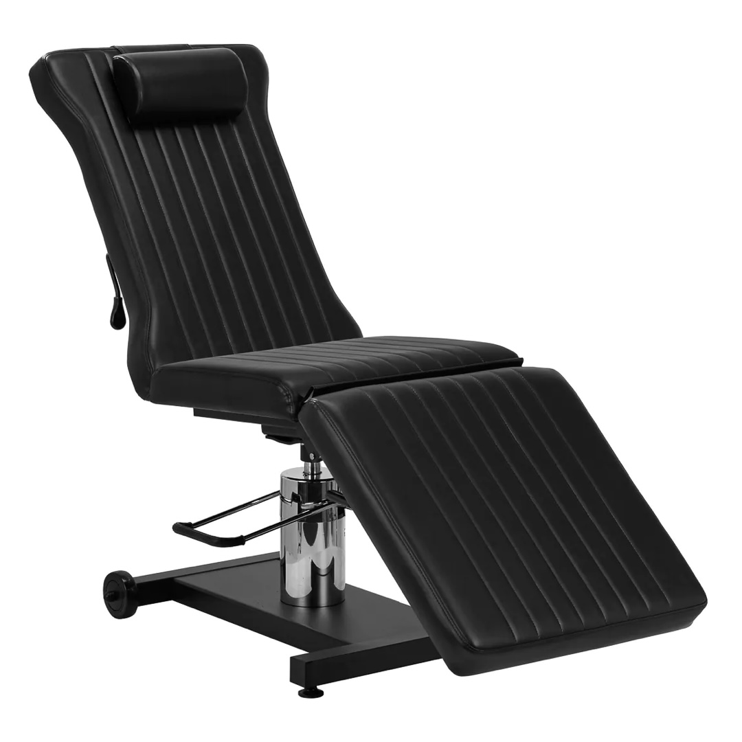 Funkční tetovací křeslo Pro Ink 612 s hydraulickým pohonem umožňuje ergonomické provádění služeb v tetovacím salonu. Úhly opěradla se nastavují ručně a aretují pákou. Sklon podnožky lze také nastavit a zaaretovat, takže židli lze umístit do polohy gauče. Díky použití účinného hydraulického pohonu si uživatel může plynule nastavit výšku židle v širokém rozsahu od 55 do 73 cm. Pěnová výplň křesla je odolná proti deformaci. Potah je vytvořen syntetickou kůží v odstínech černé a stabilní kovový rám zajišťuje odolnost a snadné čištění zařízení. Estetické prošívání mu dodává jedinečný charakter. Kolečka umístěná v jedné části podstavce ovlivňují pohyblivost nábytku a usnadňují jeho přemisťování.