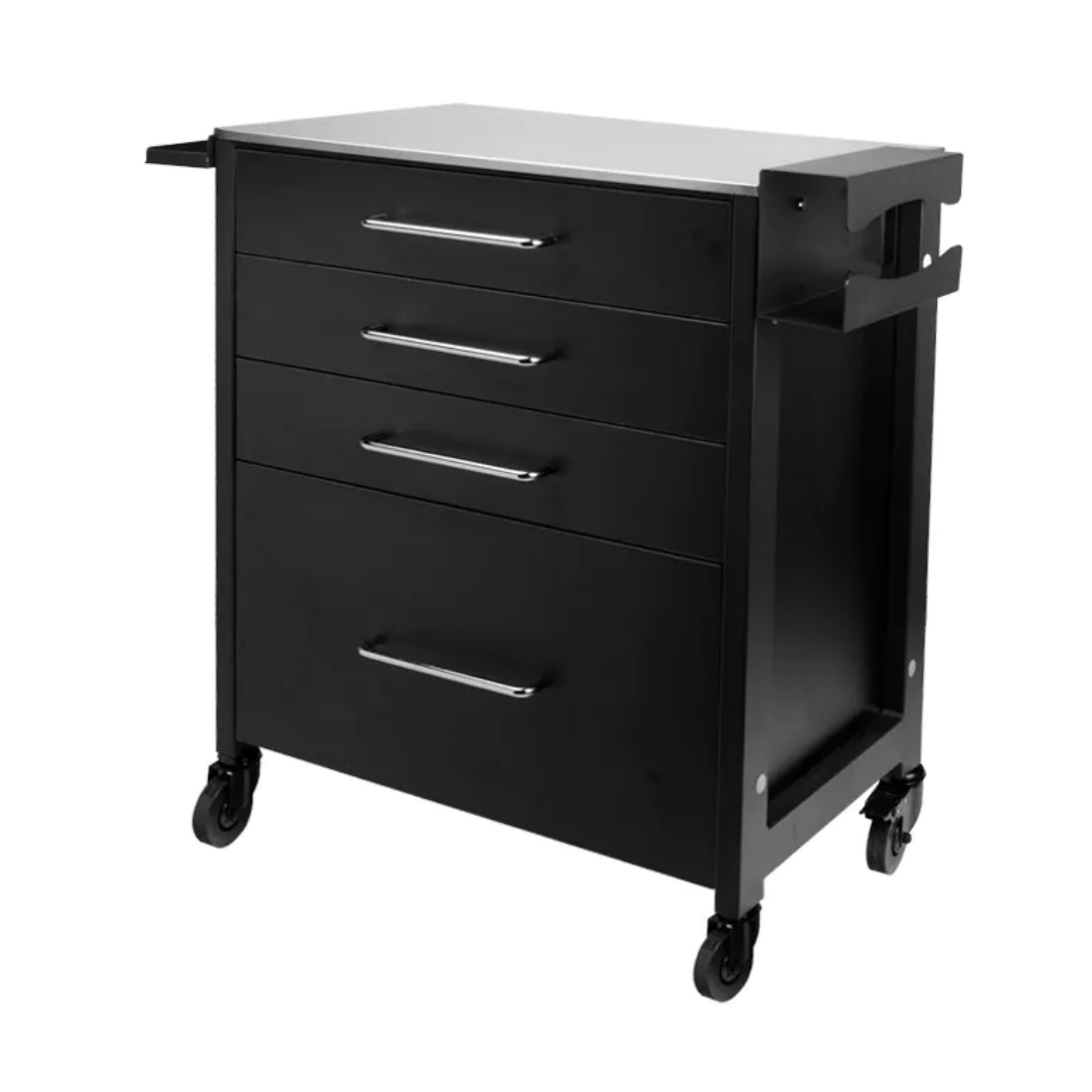 Pro Ink 702 tetovací asistent pro skladování tetovacího vybavení. Díky robustní ocelové konstrukci zaručuje dlouhou životnost. Dřevěné zásuvky a chromované úchyty dodávají elegantní vzhled. Hliníková horní deska zajistí čistotu při práci s pigmenty. Tři malé zásuvky a jedna velká prostorná skříňka pojmou vybavení, příslušenství a mnoho dalšího. Vše, co potřebujete během sezení, uspořádáte na jednom místě. Díky pogumovaným kolečkům (s brzdami) se skříňka i přes svou hmotnost snadno přemisťuje.