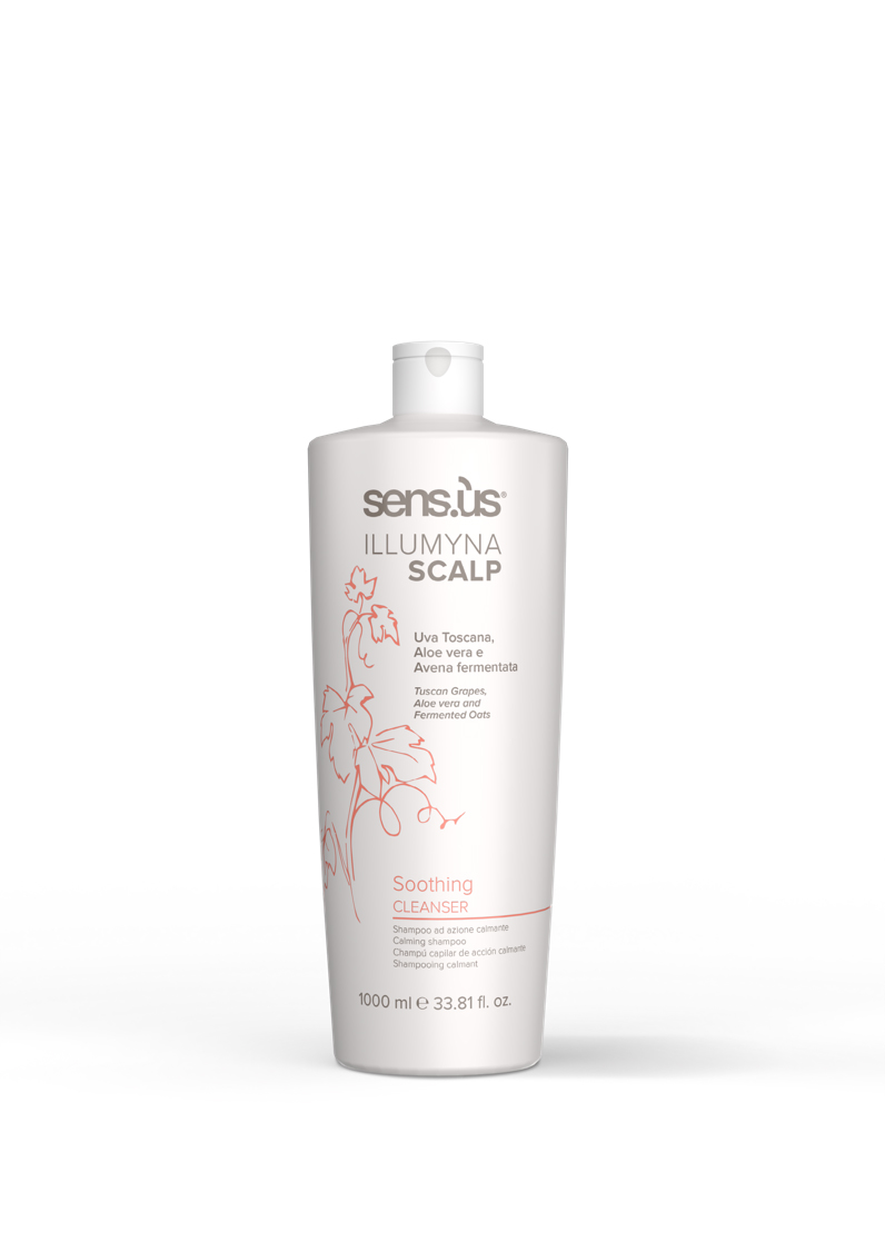 Sens.us Illumyna Scalp Soothing Cleanser je zklidňující šampon. Má zklidňující účinky na pokožku hlavy. Ideální pro namáhanou a často mytou pokožku hlavy. Obohacený o výtažky z toskánských hroznů, aloe vera a fermentovaného ovsa. Toskánské hrozny mají antioxidační účinky. Aloe vera zklidní svědivou pokožku hlavy a zároveň zabraňuje vzniku kožního mazu. Fermentovaný oves pokožku hlavy zklidní a působí na ni protizánětlivě a antioxidačně.