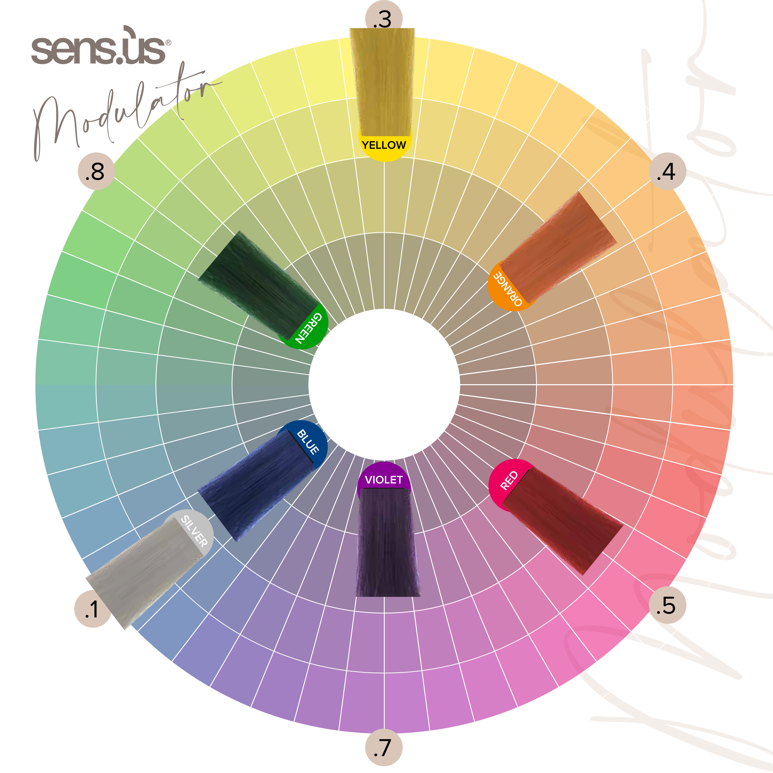 Řada Sens.ùs MODULÁTOR se skládá ze 7 čistých barev. Řada zahrnuje základní a sekundární barvy a je plně míchatelná mezi sebou. Modulátor pomáhá jemně doladit intenzitu tónu, což umožňuje náročným koloristům řídit a přizpůsobovat jejich barevné kreace.