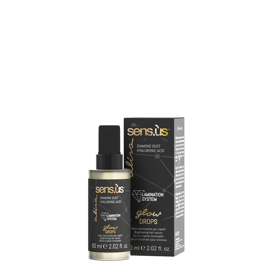 Sensus Alisa Glow Drops je rozjasňující fluid (kapky) pro matné vlasy. Obsahuje kyselinu hyaluronovou a diamantový prach. Tento produkt je součástí služby laminace Alisa Glow. Kyselina hyaluronová se svými silnými hydratačními vlastnostmi vyplňuje a chrání strukturu vlasů. Mikrokrystaly diamantového prachu vlasy rozzáří a dodá jim oslňující lesk.