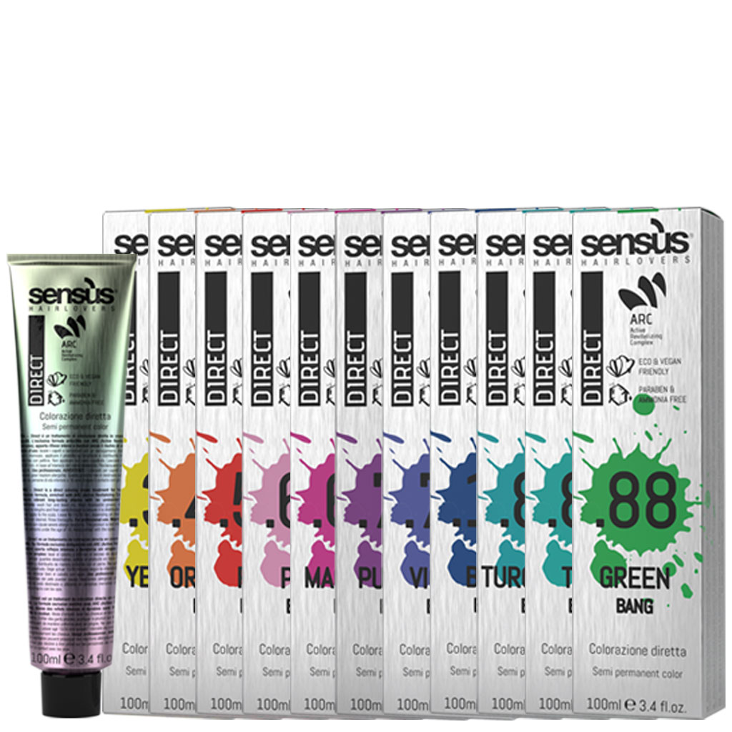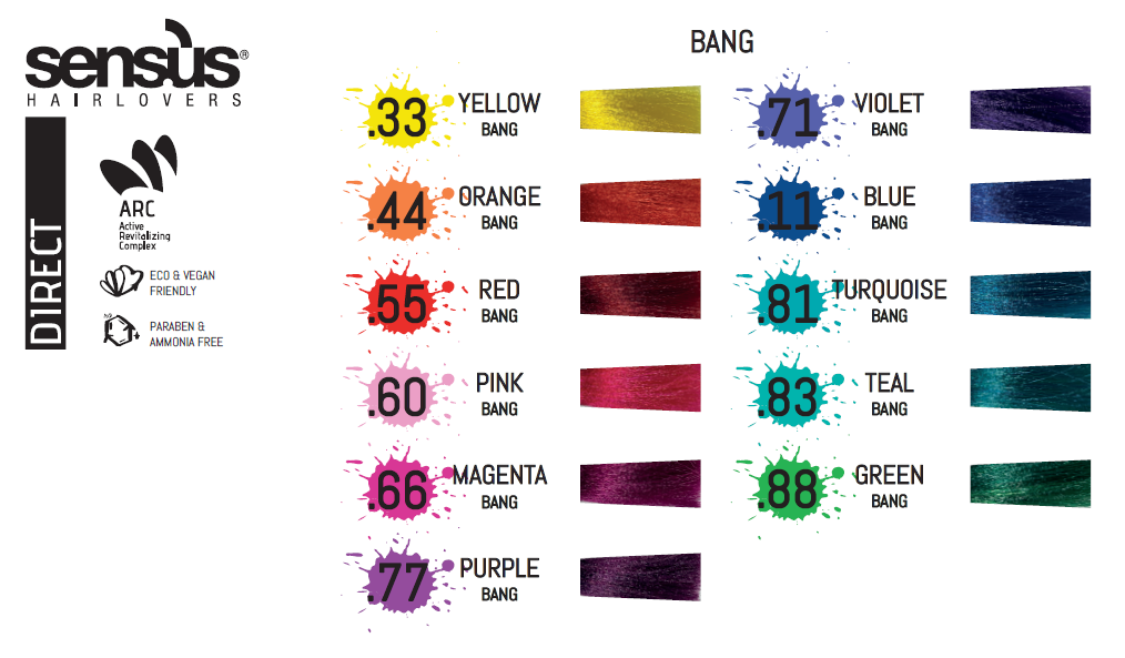 Sensus Direct Bang je přímý barvící pigment na vlasy. Exkluzivní receptura, obohacená o ARC (aktivní revitalizační komplex), poskytuje pestré dlouhotrvající odstíny. Aktivní revitalizační komplex (ARC) je směs biomimetických rostlinných aminokyselin napodobuje činnost keratinové struktury vlasů. Posiluje a omlazuje vlasy. Má regenerační, multifunkční účinek optimalizovaný pro interakci na molekulární úrovni ve vlasech. Obnovuje vlasové vlákno.