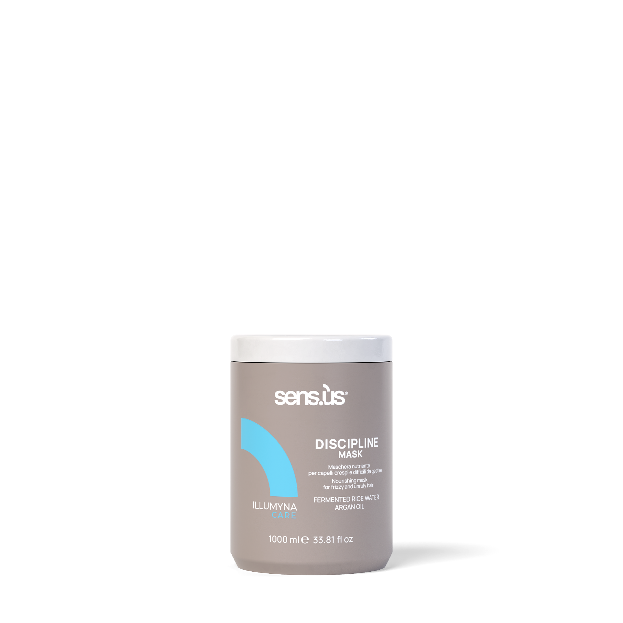 Sensus Illumyna Care Discipline Mask je výživná maska pro krepaté a nepoddajné vlasy. S fermentovanou rýžovou vodou, konopným olejem, avokádem a arganem. Ideální pro suché a krepaté vlasy. Vyživuje a chrání vlasy. Po použití jsou vlasy jemné, lesklé a poddajné.  Fermentovaná rýžová voda je cenným spojencem pro krepaté, obtížně upravitelné a často myté vlasy. Rýže, známá pro své blahodárné vlastnosti, po namočení ve vodě uvolňuje aminokyseliny, vitamíny a proteiny, které pomáhají zlepšit hebkost a lesk. Voda získaná tímto procesem díky svému mírně kyselému pH obnovuje rovnováhu pokožky hlavy a zabraňuje podráždění, díky čemuž jsou vlasy ovladatelnější a snadněji se rozčesávají. Konopný olej hloubkově vyživuje a hydratuje. Restrukturalizační účinek tohoto oleje je silným spojencem v boji proti krepatění, vytváří také ochrannou bariéru, která pomáhá předcházet ztrátě vlhkosti a podporuje růst silných vlasů. Avokádový olej je bohatý na vitamíny a antioxidanty. Proniká hluboko do vlasového vlákna a napravuje poškození, které vede ke krepatění a suchosti vlasů. Přestože je tento olej bohatý na tuky, jeho konzistence je velmi lehká, díky čemuž jsou vlasy jemné a pružné, aniž by je zatěžoval. Arganový olej díky vysokému obsahu antioxidantů, vitamínu E a omega 3 nejen hloubkově vyživuje, ale také stimuluje přirozený lesk vlasů, díky čemuž jsou viditelně zdravější.
