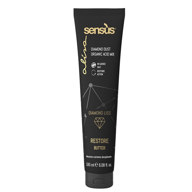 Sensus Alisa Restore Butter je vlasová maska s diamantovým extraktem, bohatá na polykyseliny a vitamín C. Dokončuje a prodlužuje kosmetické ošetření Alisa. Vlasy zůstávají jemné a hydratované. Mikrokrystaly diamantového prachu vlasy rozzáří a dodá jim oslňující lesk. Vitamín C pečuje o suché a poškozené vlasy a chrání je před škodlivým slunečním zářením a volnými radikály. Revitalizuje vlasové vlákno po celé délce a chrání vlasy před lámáním a třepením.