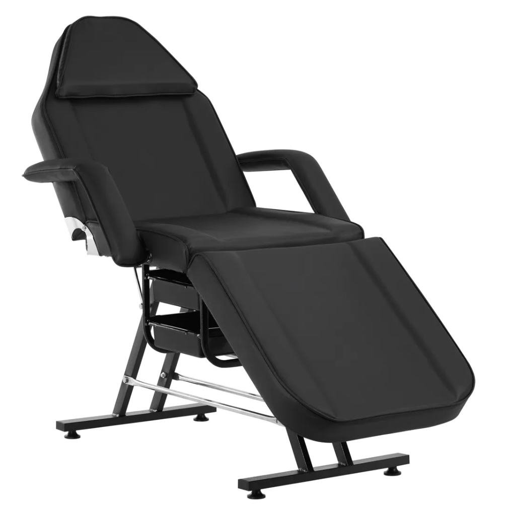 Černé kosmetické křeslo Sillon se dvěma zásuvkami, které jsou instalované pod sedadlem. Díky otvoru v opěrce hlavy, který je skrytý pod správně profilovaným polštářem, je křeslo ideální pro ošetření obličeje i zad. Stabilní područky poskytují uživateli dostatečnou oporu . Tyto prvky dělené napůl jsou pohyblivé, takže dobře padnou při změně polohy zádové opěrky a lze je také snadno vyjmout. Postupné nastavení úhlů podnožky a zádové opěrky zajišťuje speciální mechanismus. Pomocí ruční páky můžete plynule nastavit polohu sedadla. Křeslo lze sklopit do polohy gauče. Základna židle má konstantní výšku, takže sedák je na konstantní úrovni. Pevný kovový rám v odstínech černé a protiskluzové nožky, které zabraňují nekontrolovanému pohybu zařízení, poskytují potřebnou stabilitu při používání. Křeslo je vyplněno molitanem a potaženo imitací kůže v odstínech černé.