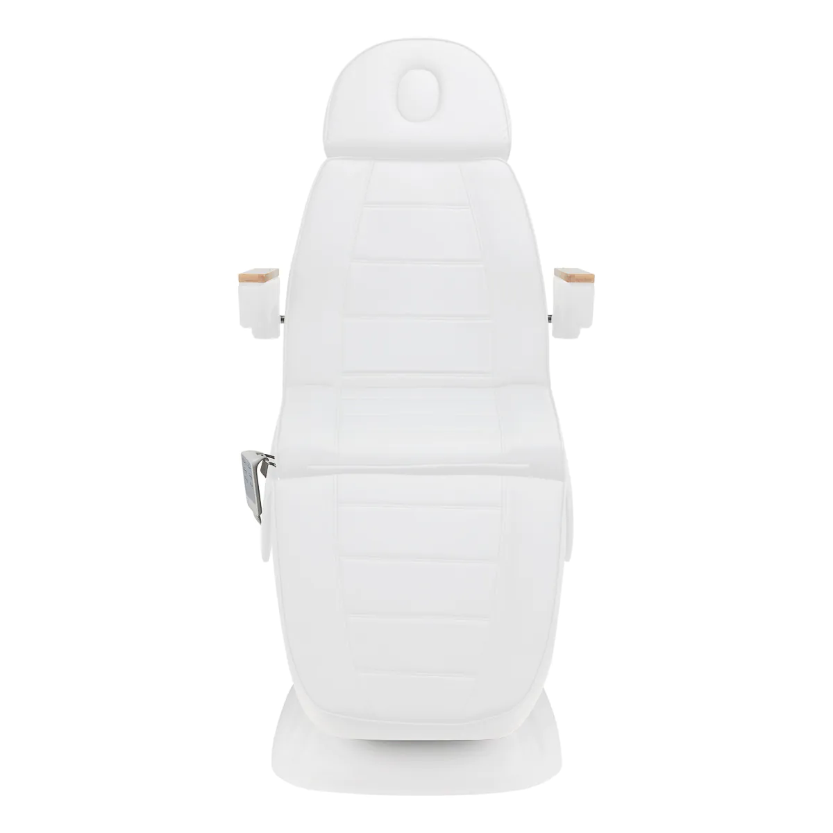 Křeslo je vyplněno pěnou odpovídající tvrdosti a potaženo na dotek příjemnou imitací kůže v odstínech bílé. Díky použití materiálu, který se snadno udržuje v čistotě a je odolný vůči vybraným dezinfekčním prostředkům, se zařízení pohodlně používá , je odolné proti vlhkosti a snadno se čistí. Pevná základna z odolného materiálu v odstínech šedé zajišťuje stabilitu při ošetření. Ozdobné dřevěné prvky na područkách odlišují křeslo od ostatních modelů a vytvářejí vizuálně atraktivní a elegantní akcent . Správně profilované lemy dodávají židli stylový vzhled a dělají sedák ergonomickým .