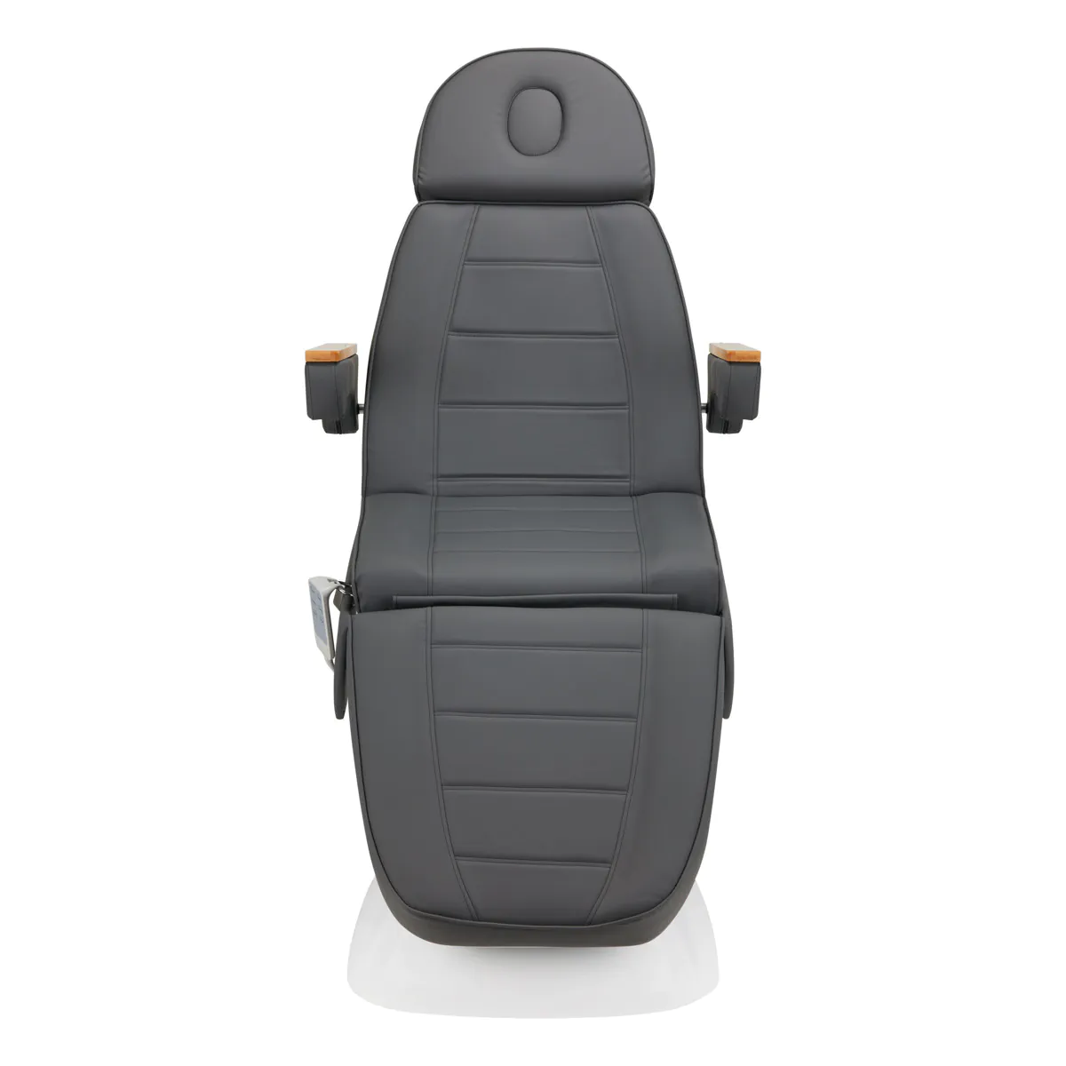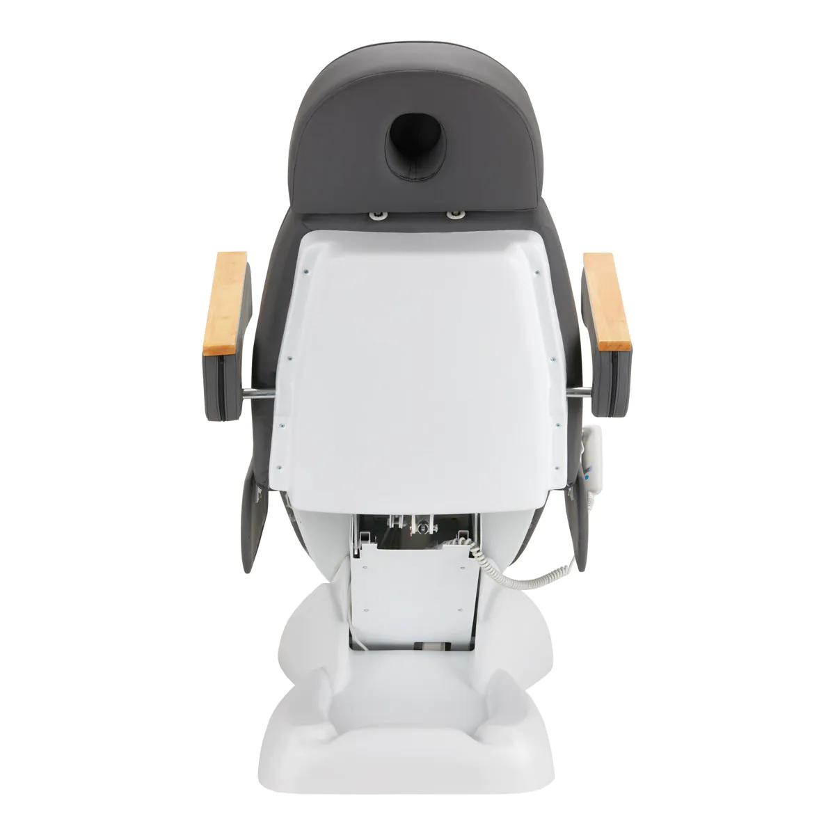 Křeslo je vyplněno pěnou odpovídající tvrdosti a potaženo na dotek příjemnou imitací kůže v odstínech šedá s podstavou bílou. Díky použití materiálu, který se snadno udržuje v čistotě a je odolný vůči vybraným dezinfekčním prostředkům, se zařízení pohodlně používá , je odolné proti vlhkosti a snadno se čistí. Pevná základna z odolného materiálu v odstínech šedé zajišťuje stabilitu při ošetření. Ozdobné dřevěné prvky na područkách odlišují křeslo od ostatních modelů a vytvářejí vizuálně atraktivní a elegantní akcent . Správně profilované lemy dodávají židli stylový vzhled a dělají sedák ergonomickým .