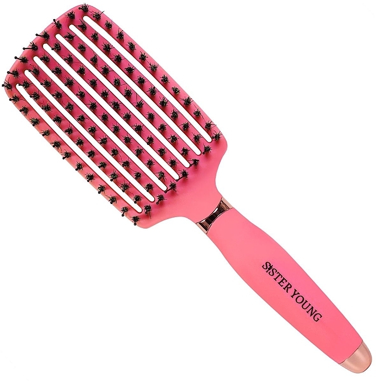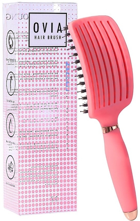 Sister Young Ovia BV zakřivený kartáč s ventilací pro rozčesávání a rychlejší vysoušení všech typů vlasů, mokrých i suchých. Měkké kančí a antistatické nylonové štětiny umožňují jemné rozčesávání a uhlazování vlasů bez rizika jejich lámání nebo poškození. Přírodní kančí štětiny pomáhají přerozdělovat přirozené oleje z pokožky hlavy do vlasů a zajišťují jejich zdravý a lesklý vzhled.