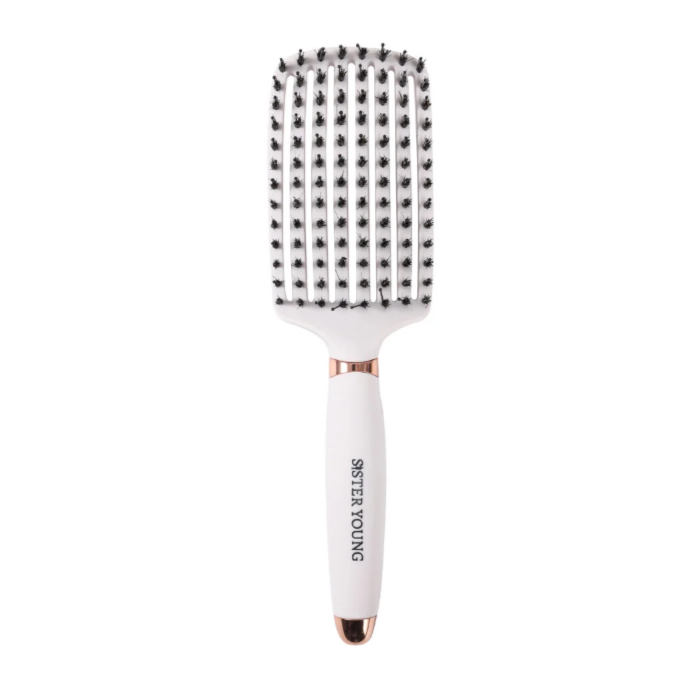 Sister Young Ovia BV zakřivený kartáč s ventilací pro rozčesávání a rychlejší vysoušení všech typů vlasů, mokrých i suchých. Měkké kančí a antistatické nylonové štětiny umožňují jemné rozčesávání a uhlazování vlasů bez rizika jejich lámání nebo poškození. Přírodní kančí štětiny pomáhají přerozdělovat přirozené oleje z pokožky hlavy do vlasů a zajišťují jejich zdravý a lesklý vzhled.
