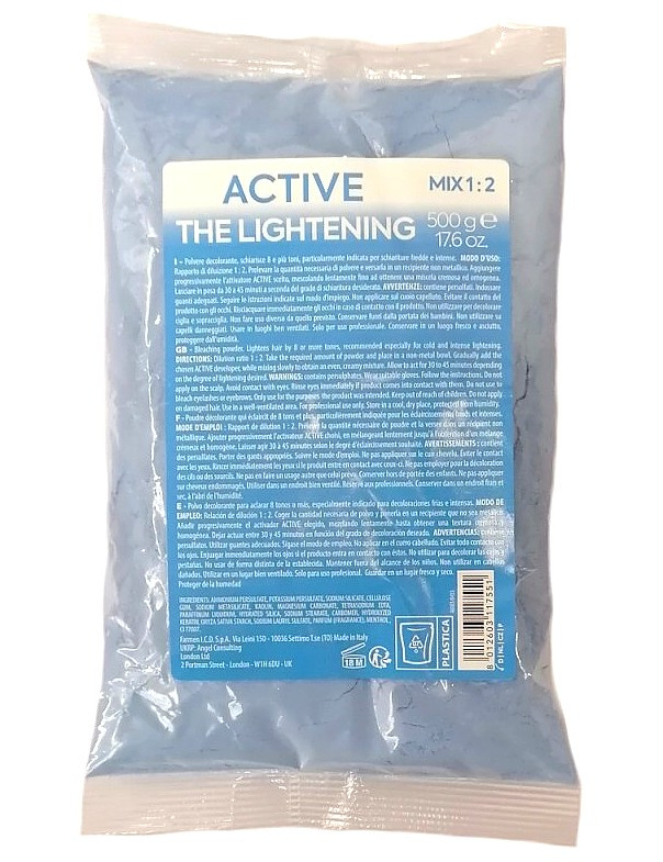 Modrý bezprašný melírovací prášek, který dokáže vlasy zesvětlit až o 8 tónů.